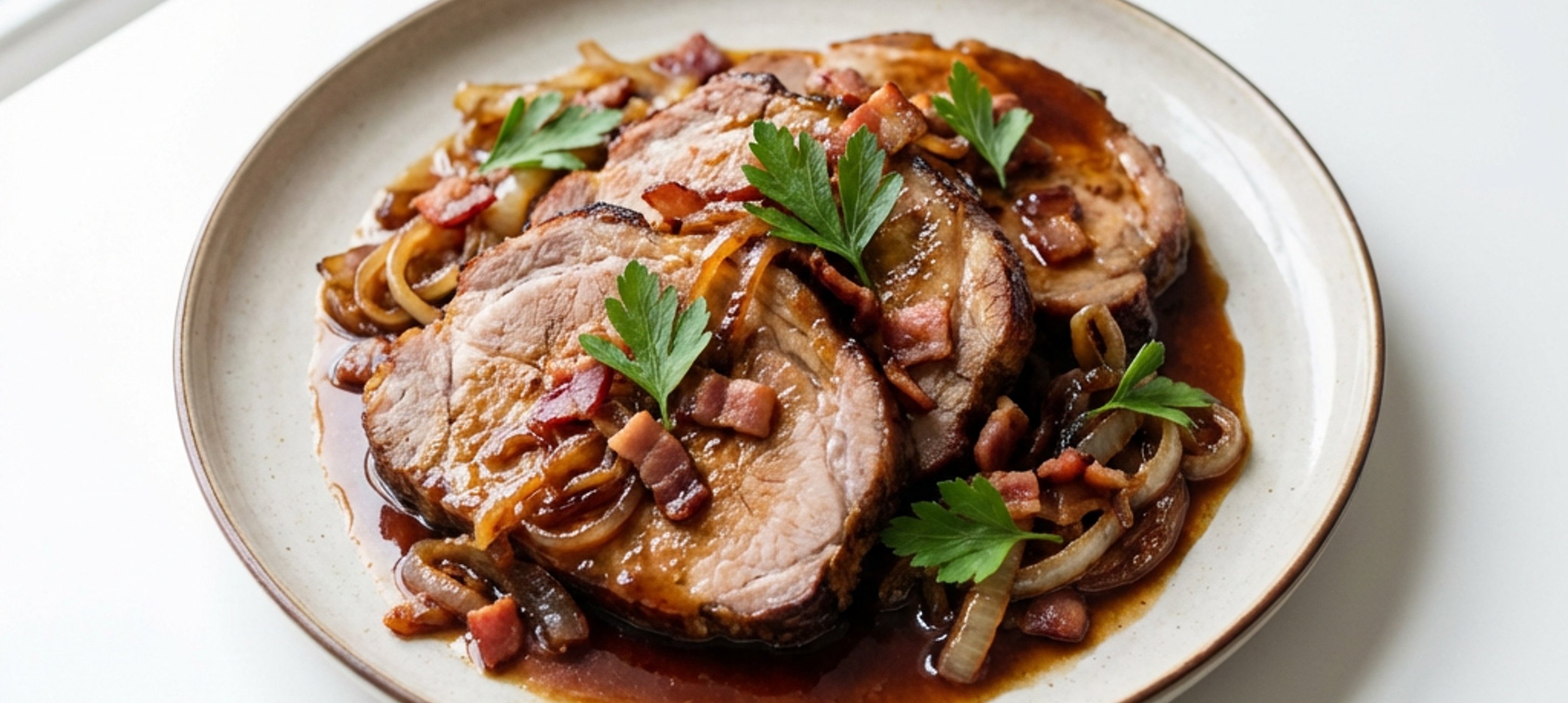 - 5Öntsük a serpenyő tartalmát a húsra, és tegyük a tepsit a sütőbe kb. 1,5 órára. Sütés után hagyjuk a húst 5 percig pihenni a szaftban. Tálalás előtt a mártást ízlés szerint utólag is sózhatjuk, és szórjuk meg friss, aprított petrezselyemmel.