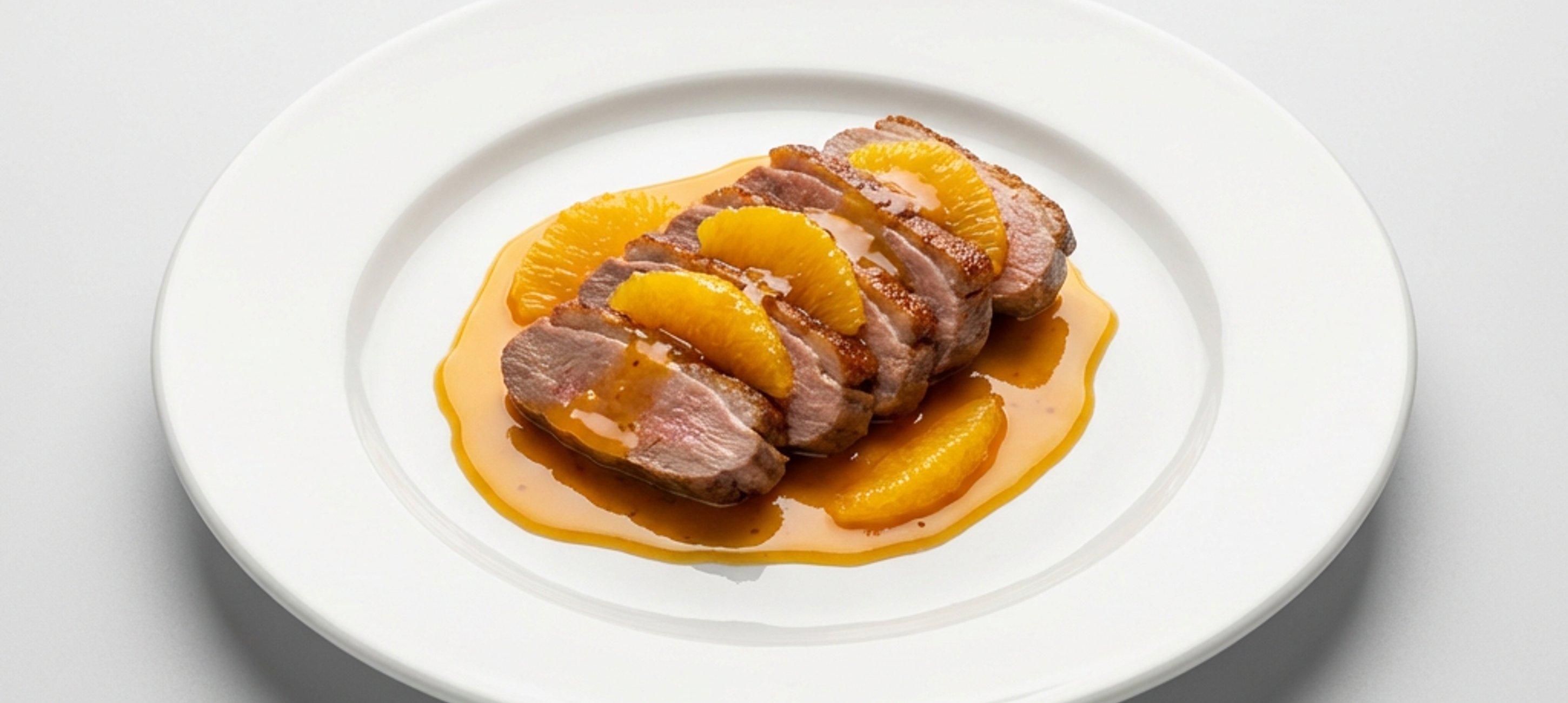 - 11A narancskarikákat rendezzük el a tányérokon, helyezzük rájuk a felszeletelt kacsamellet, locsoljuk meg a mártással, és szórjuk meg egy kevés sópehellyel.
