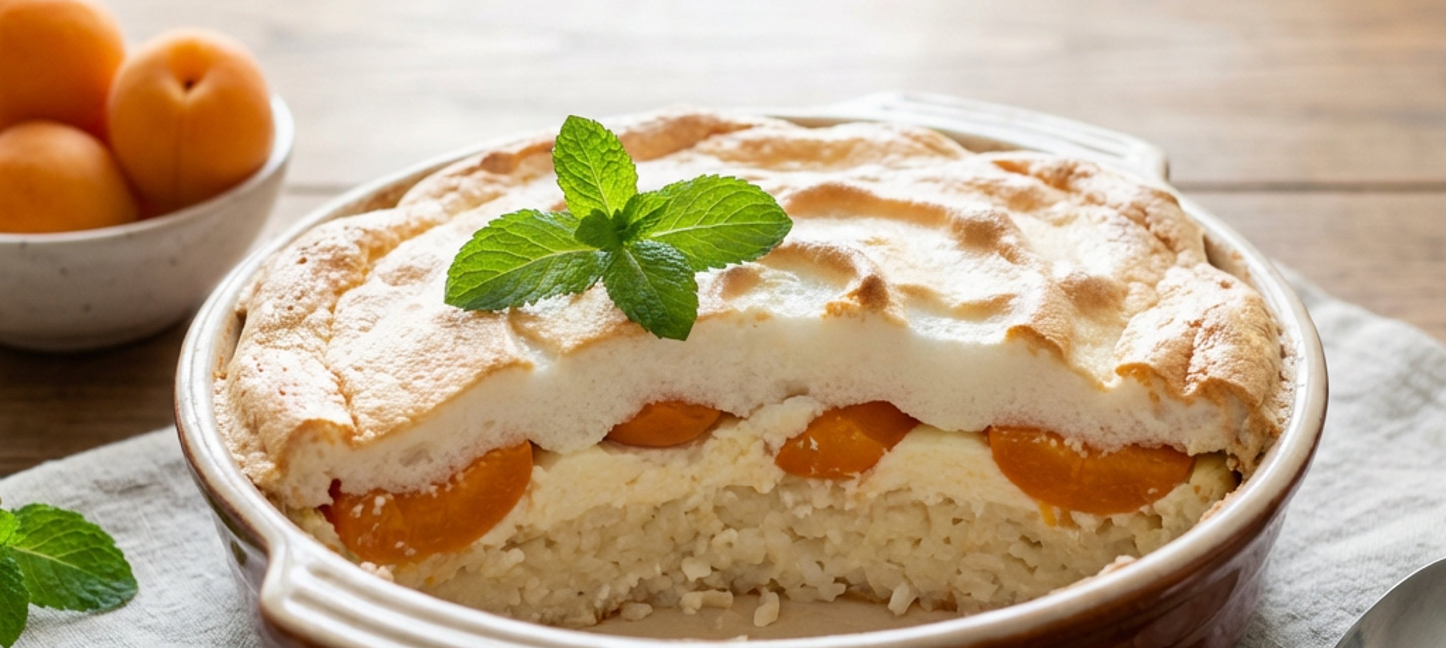- 6A formát a sütő középső rácsára helyezzük, és 25 percig sütjük. Közben a három tojásfehérjét a maradék 60 g cukorral kemény habbá verjük. A sütési idő lejárta után a habot a felfújt tetejére simítjuk, és grill fokozaton további 3 percig pirítjuk, amíg a teteje aranybarna nem lesz.