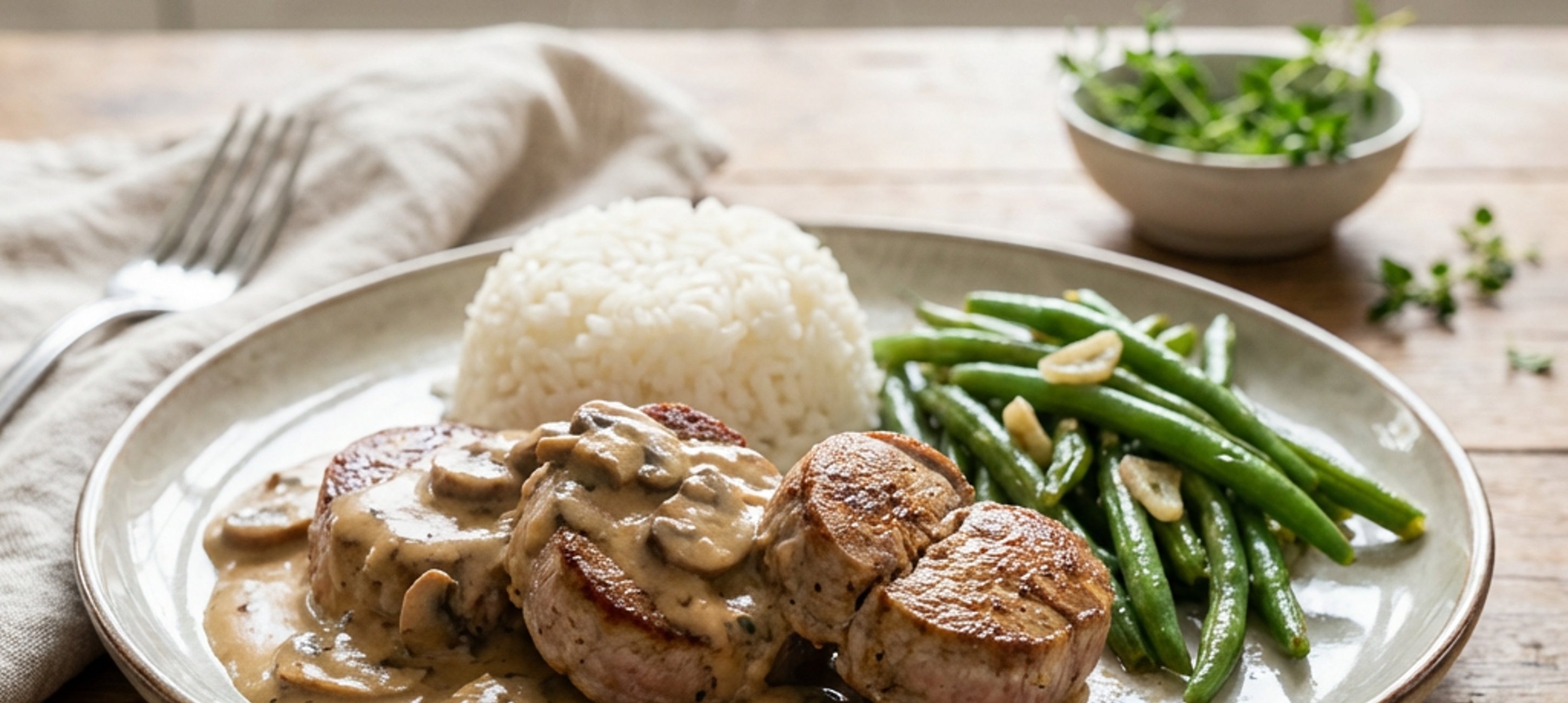 - 5Tálald a szaftos húsérméket a krémes gombamártással, a fokhagymás zöldbabbal és a párolt rizzsel.