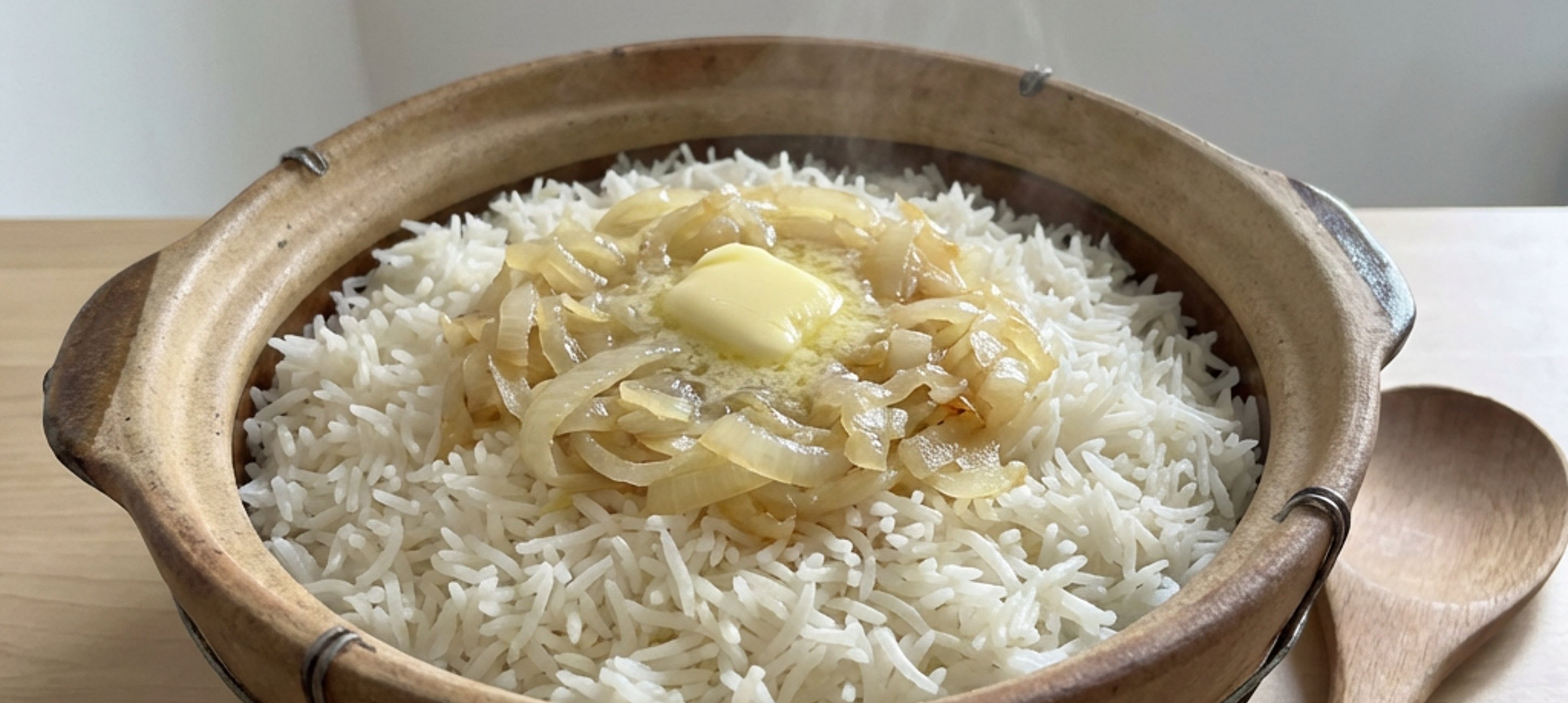 - 3Egy tűzálló lábasban közepes lángon olvasszuk fel a vajat. Adjuk hozzá az aprított hagymát, és pároljuk üvegesre. Öntsük hozzá a rizst, és folyamatosan kevergetve pirítsuk 1-2 percig, amíg a szemek átforrósodnak.
