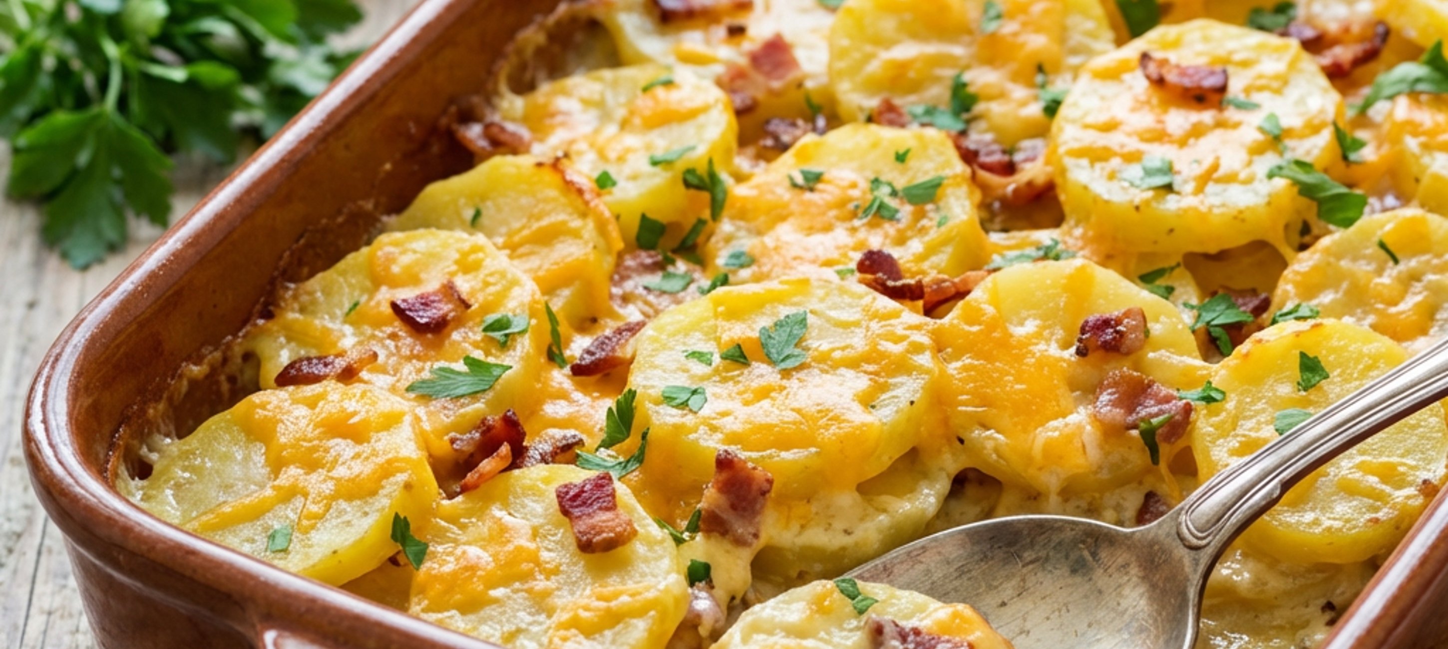 - 4A burgonyaszeleteket szűrőkanállal szedd át a sütőformába úgy, hogy a lábasban maradjon kb. 200 ml a tejszínes-tejes keverékből. Ebbe a maradék folyadékba szórd bele a reszelt edami és cheddar sajtot, majd alacsony lángon olvaszd fel (1–2 perc). Ízesítsd sóval és borssal, végül keverd hozzá az aprított petrezselyemzöldet. Öntsd a mártást a burgonyára, és süsd 180–190 °C-on 40–45 percig.