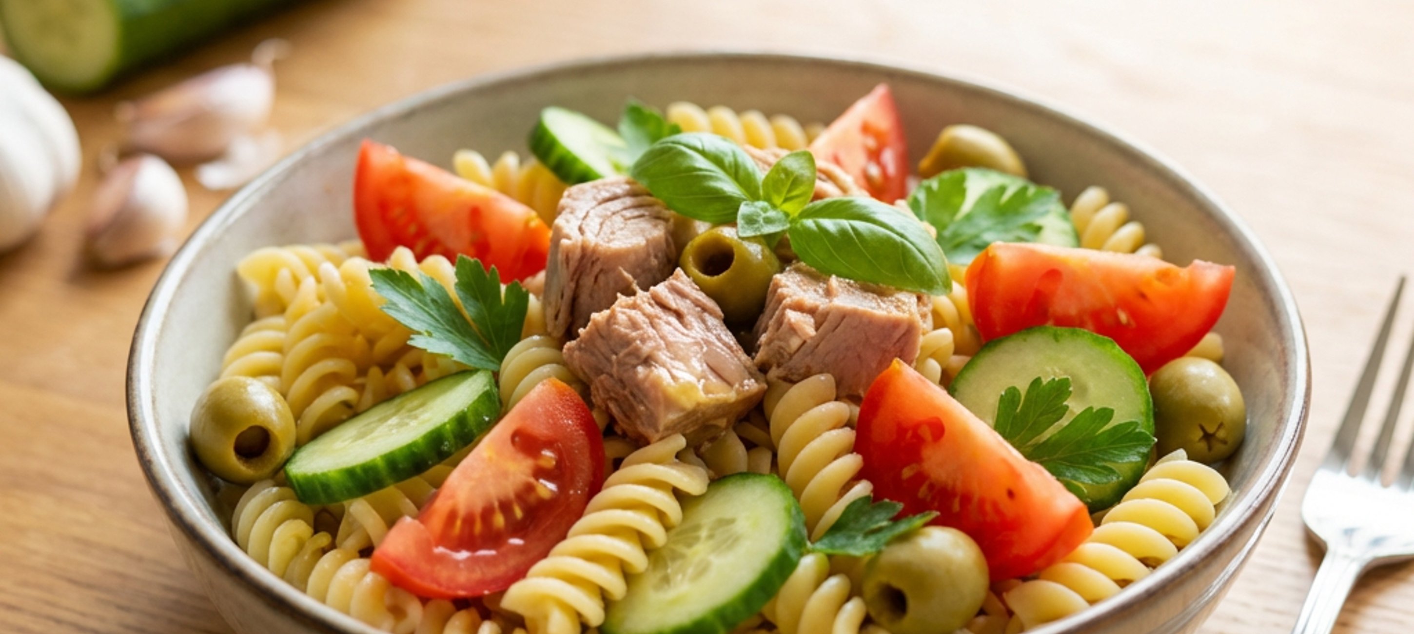 - 3Egy nagy tálban forgasd össze a még meleg tésztát, a fokhagymás öntetet, a felaprított zöldségeket és a darabokra szedett tonhalat. Ízlés szerint sózd, majd add hozzá az olívabogyót és a friss fűszernövényeket. Tálalás előtt alaposan keverd össze.