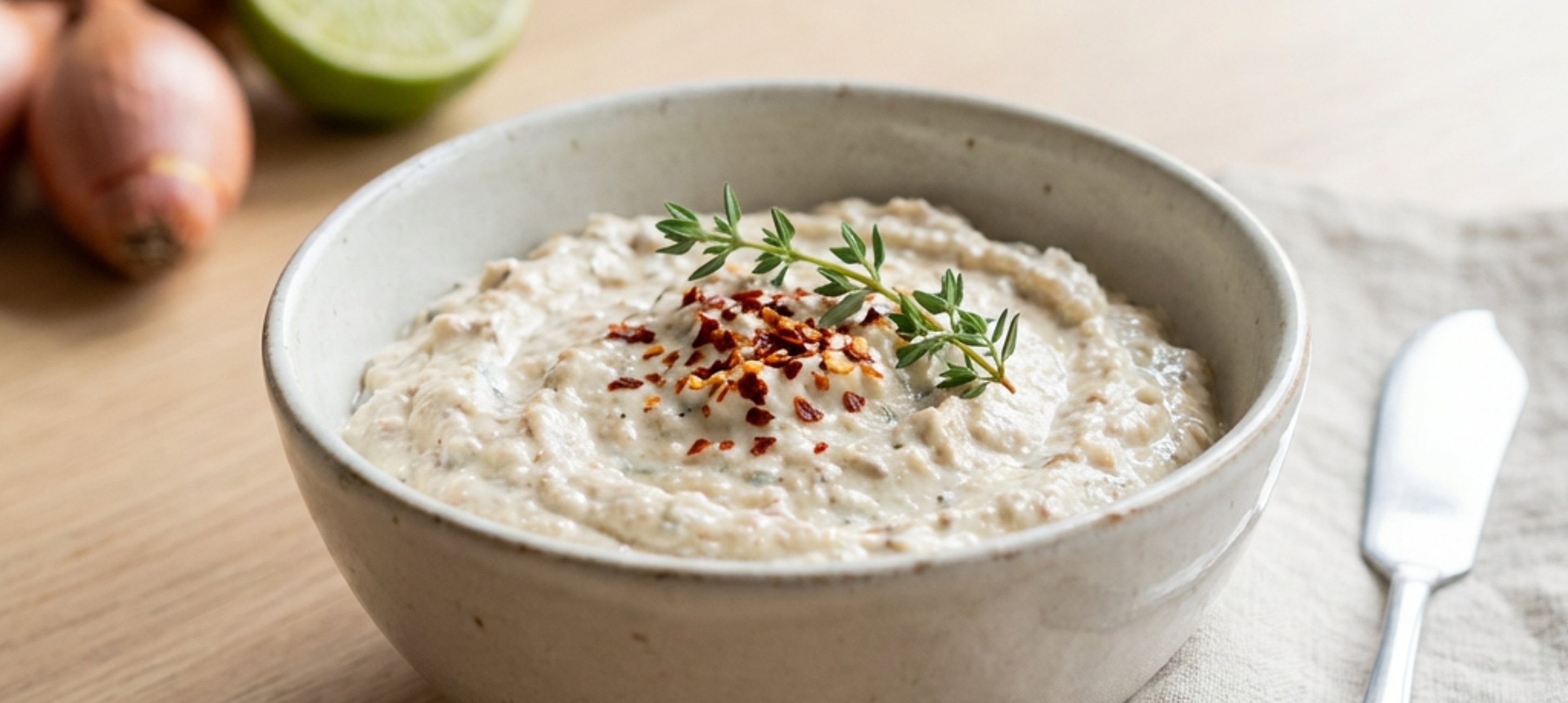 - 2Add hozzá a finomra vágott salottahagymát, a zsírszegény túrót, a limelét, a dijoni mustárt, a szárított kakukkfüvet és az átnyomott fokhagymát.