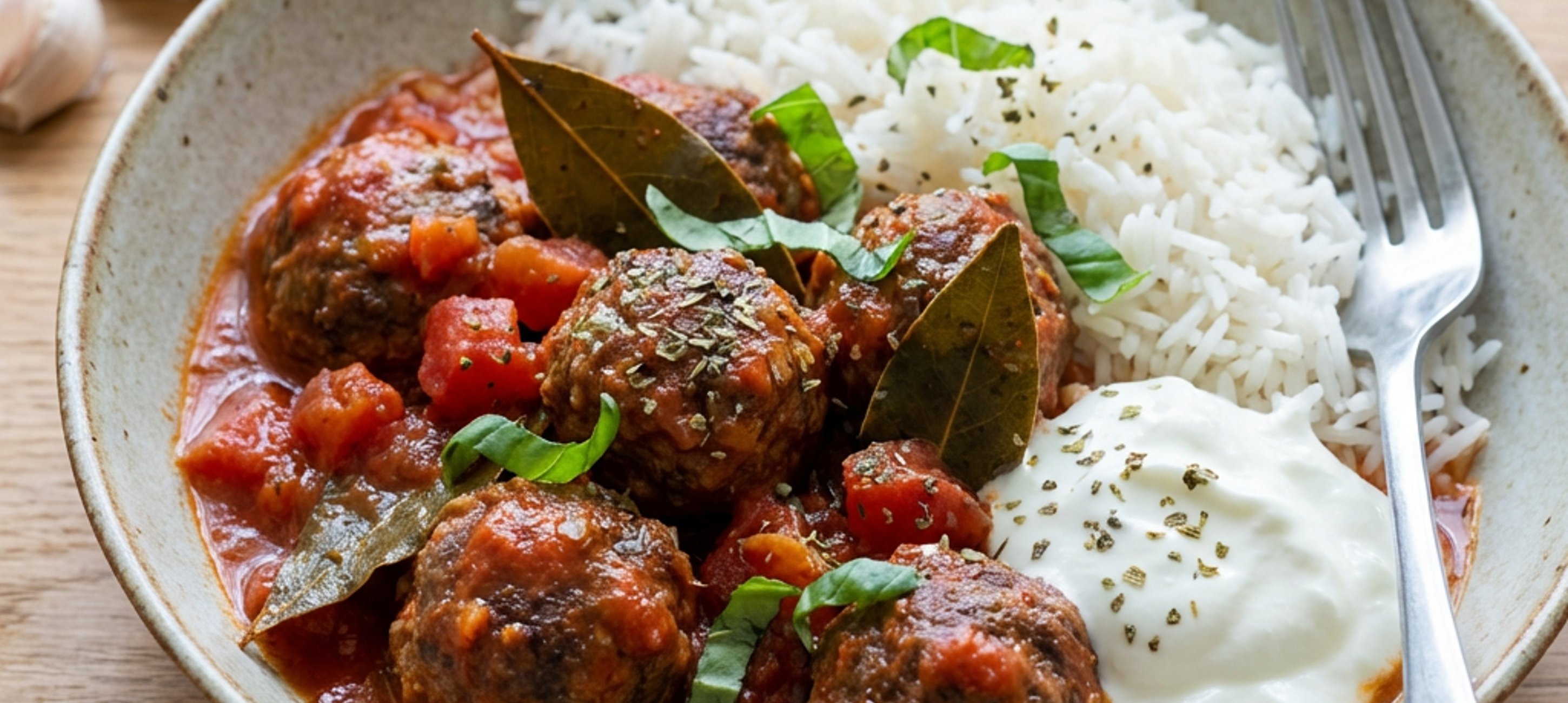 - 6A kész húsgombócokat tálaljuk a párolt rizzsel, egy-egy kanál görög joghurttal a tetején. Díszítsük friss bazsalikommal vagy extra oregánóval.
