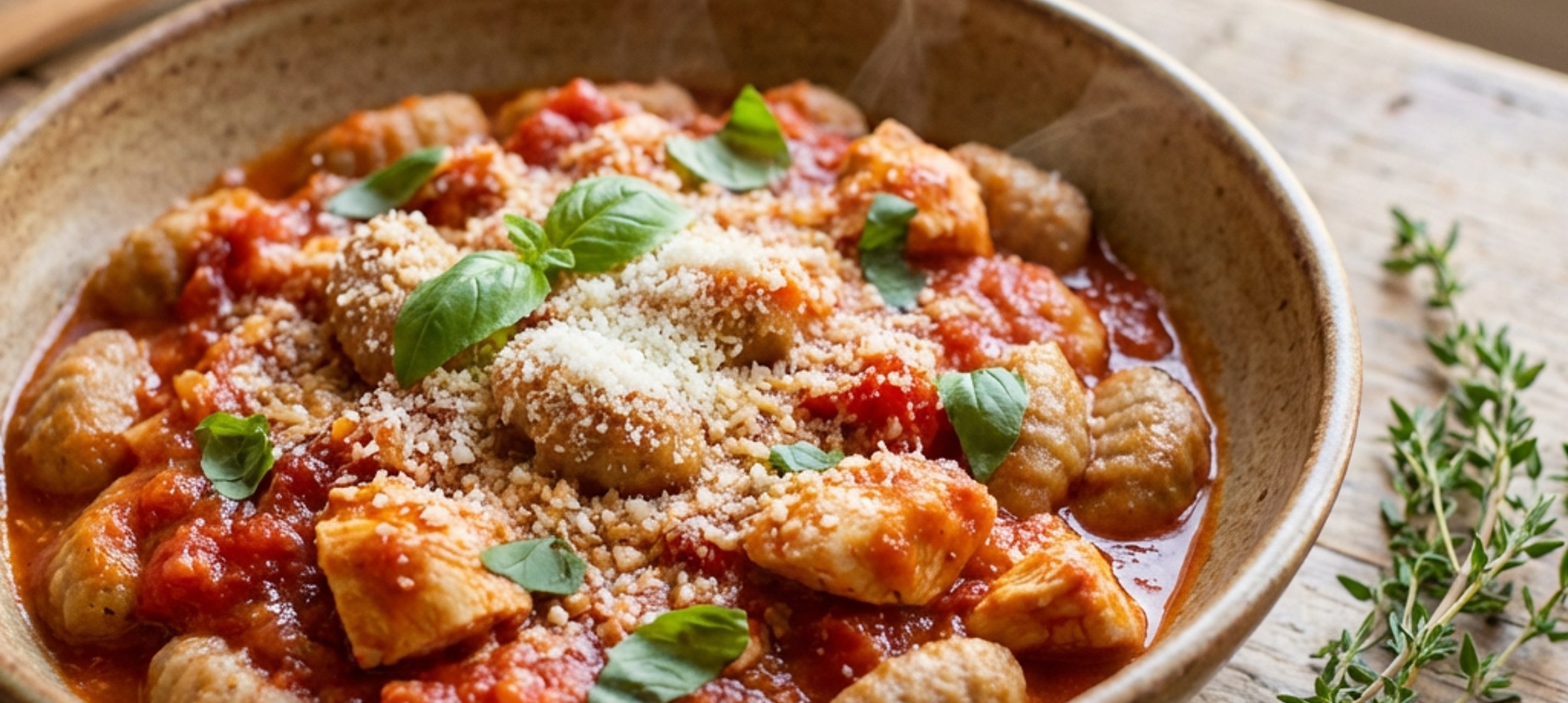 - 3Főzd a paradicsomos mártást kb. 15 percig erős lángon. Ezután vedd lejjebb a hőt közepesre, tedd vissza a csirkehúst, add hozzá a cukrot, és főzd további 5 percig. Végül add hozzá a gnocchit, a parmezánt, a sót és a borsot, majd főzd 8–10 percig (vagy a csomagoláson jelzett ideig), időnként megkeverve, hogy a gnocchi ne ragadjon le.