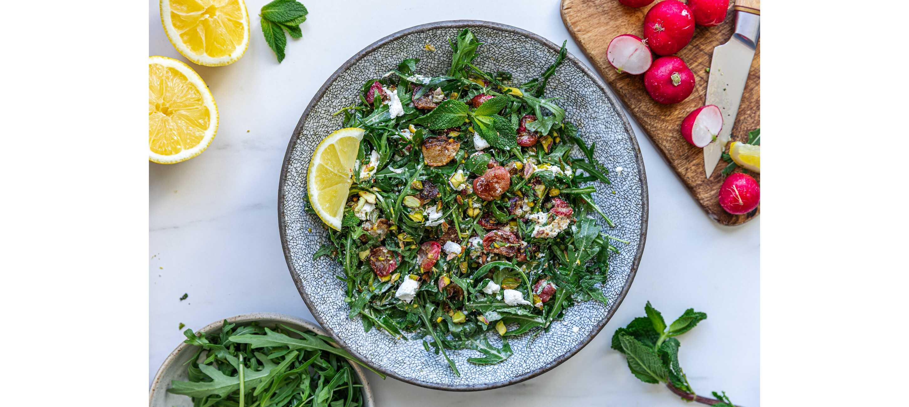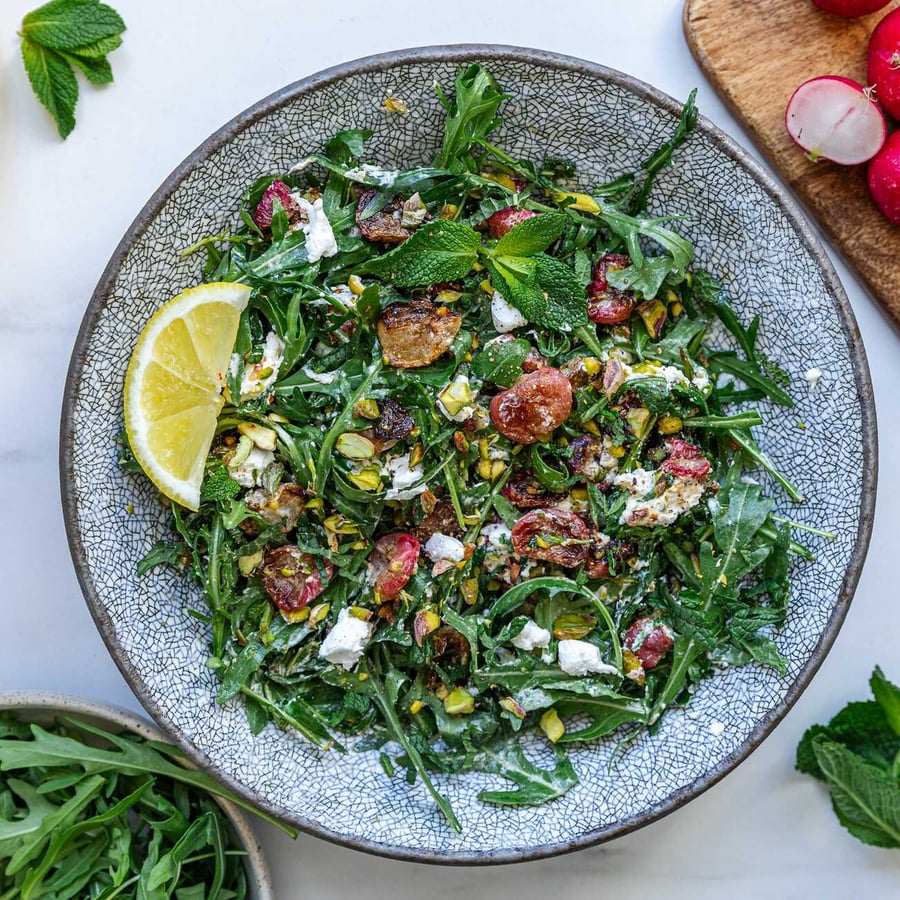- 5Egy nagy tálban keverd össze a rukkolát, a kecskesajt darabokat, a sült retket, a vágott mentát és a pisztáciát. Locsold meg az öntettel, és forgasd össze az egészet.