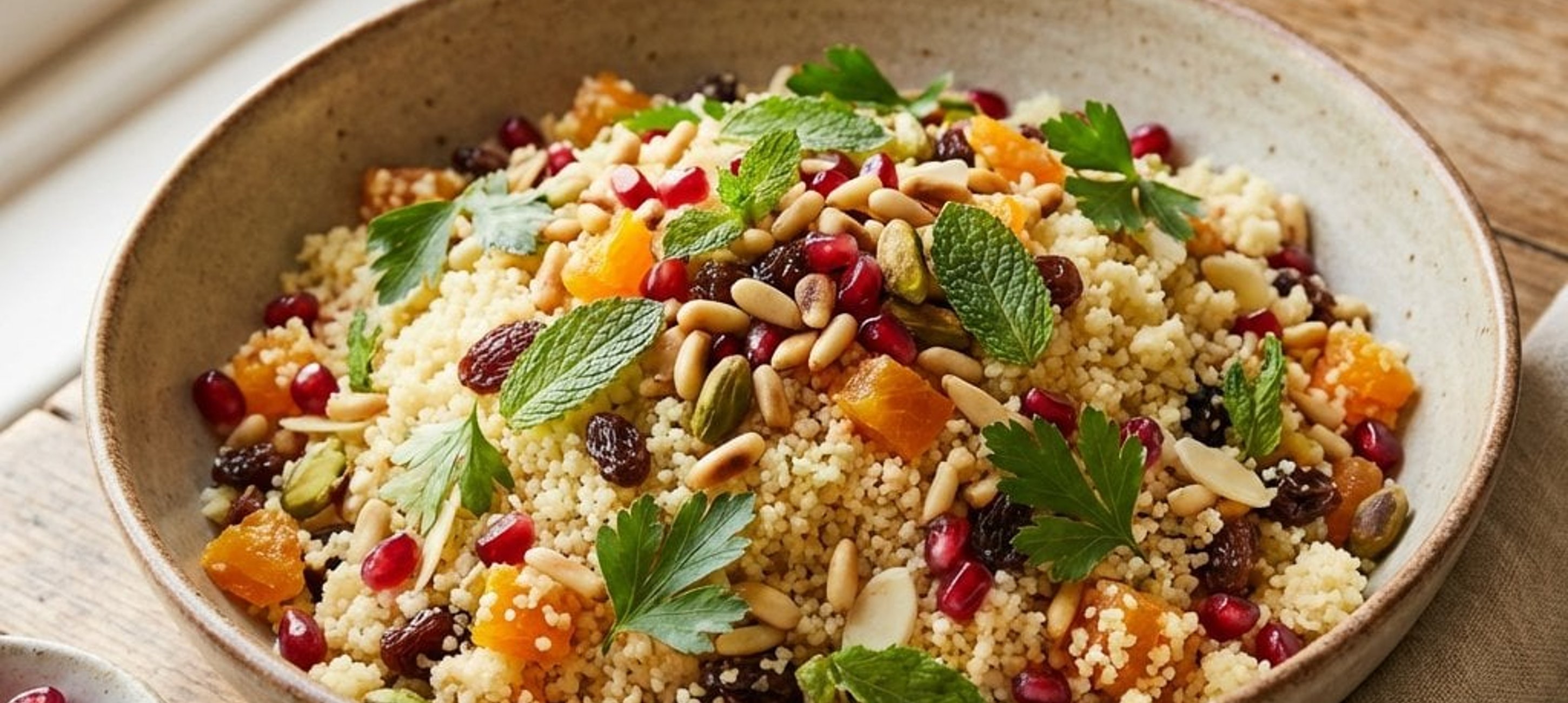 - 6Vágjuk félbe a gránátalmát, és egy kanál segítségével ütögessük ki belőle a magokat. Távolítsuk el a fehér hártyákat. A sárgabarackot vágjuk apróra, a pisztáciát durvára. A kész kuszkuszhoz keverjük hozzá a fenyőmagot, a pisztáciát, a mandulát, az aszalt gyümölcsöket, a pirított kókuszt, a vágott zöldfűszereket, a gránátalma magjait, valamint a citromhéjat és a citromlevet. Végül forgassuk bele a maradék olívaolajat, ízlés szerint sózzuk, borsozzuk, és alaposan keverjük össze.
