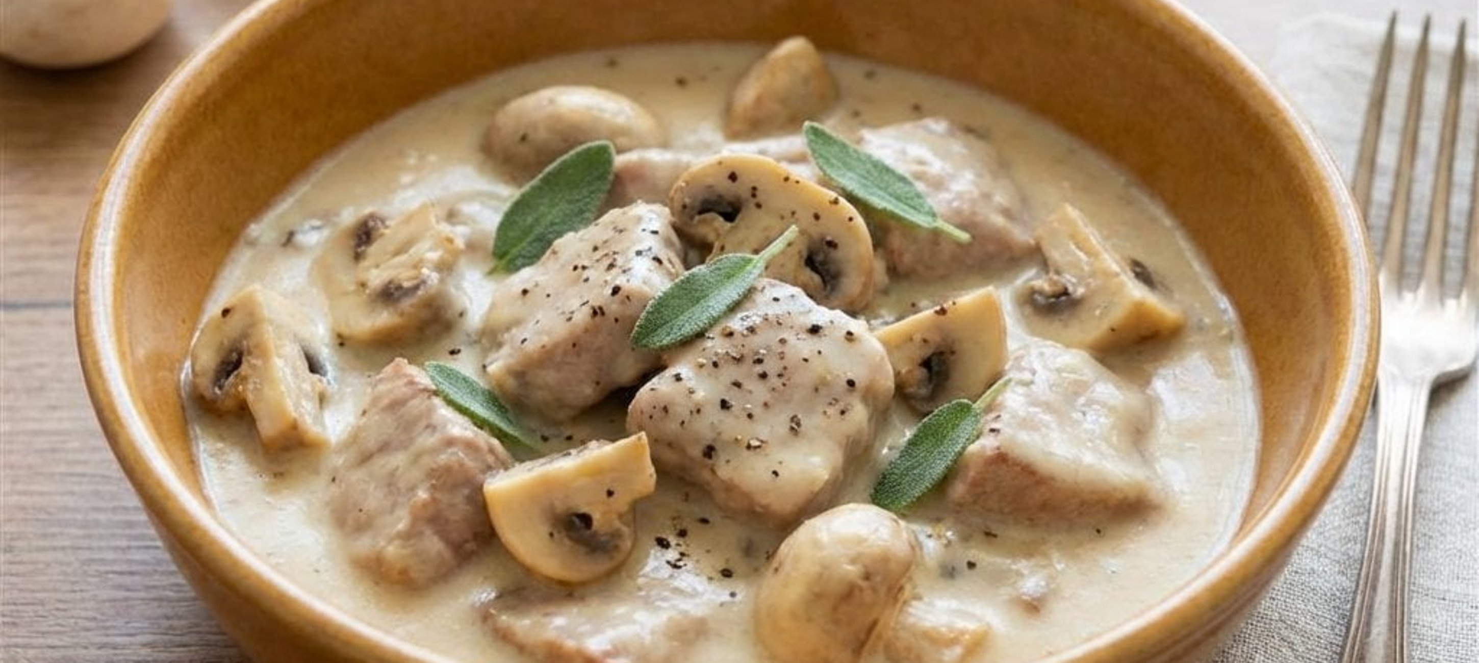 - 1Amikor a hús megpuhult, vegyük ki a lábasból és tegyük félre. A mártást szűrjük át egy tiszta edénybe, adjuk hozzá a tejszínt, keverjük el, és botmixerrel pürésítsük selymesre. Forraljuk fel újra, tegyük vissza a húst, és főzzük további 3 percig.