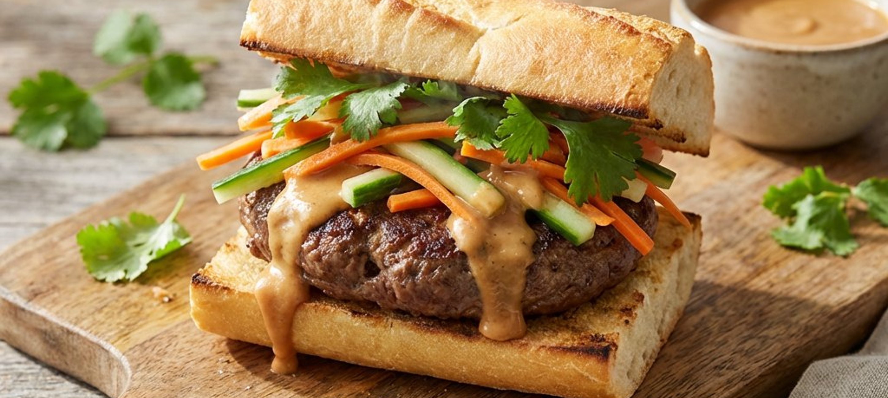 - 6A bagett alsó részét kenjük meg a mogyorós szósszal, helyezzük rá a húst, tegyük rá a marinált zöldségeket, és szórjuk meg bőségesen friss korianderrel. Fedjük le a bagett felső részével, és azonnal tálaljuk.