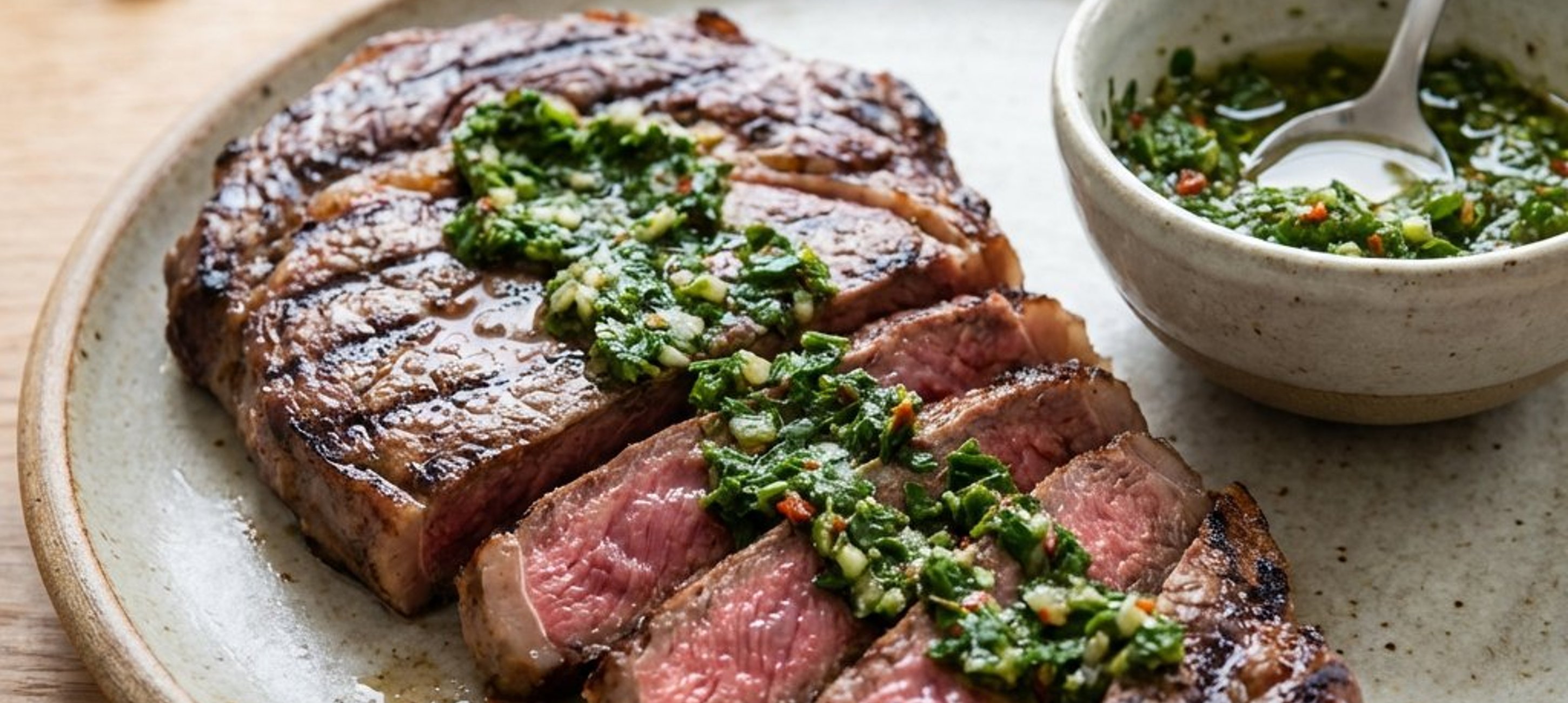 - 3A pihentetett steaket szeleteljük fel, és a friss chimichurri mártással leöntve tálaljuk.