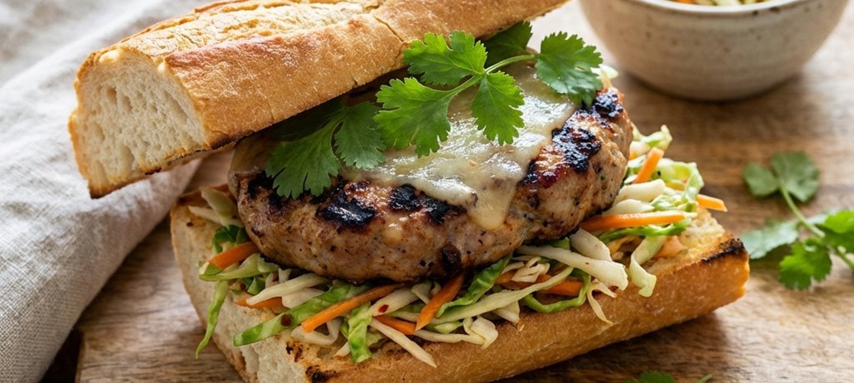 - 3A bagetteket vágjuk félbe hosszában, és a vágott felükkel lefelé pirítsuk meg a grillen. A bagett alsó részére halmozzunk a salátából, helyezzük rá a húspogácsát, szórjuk meg friss korianderrel, majd fedjük le a bagett felső részével.