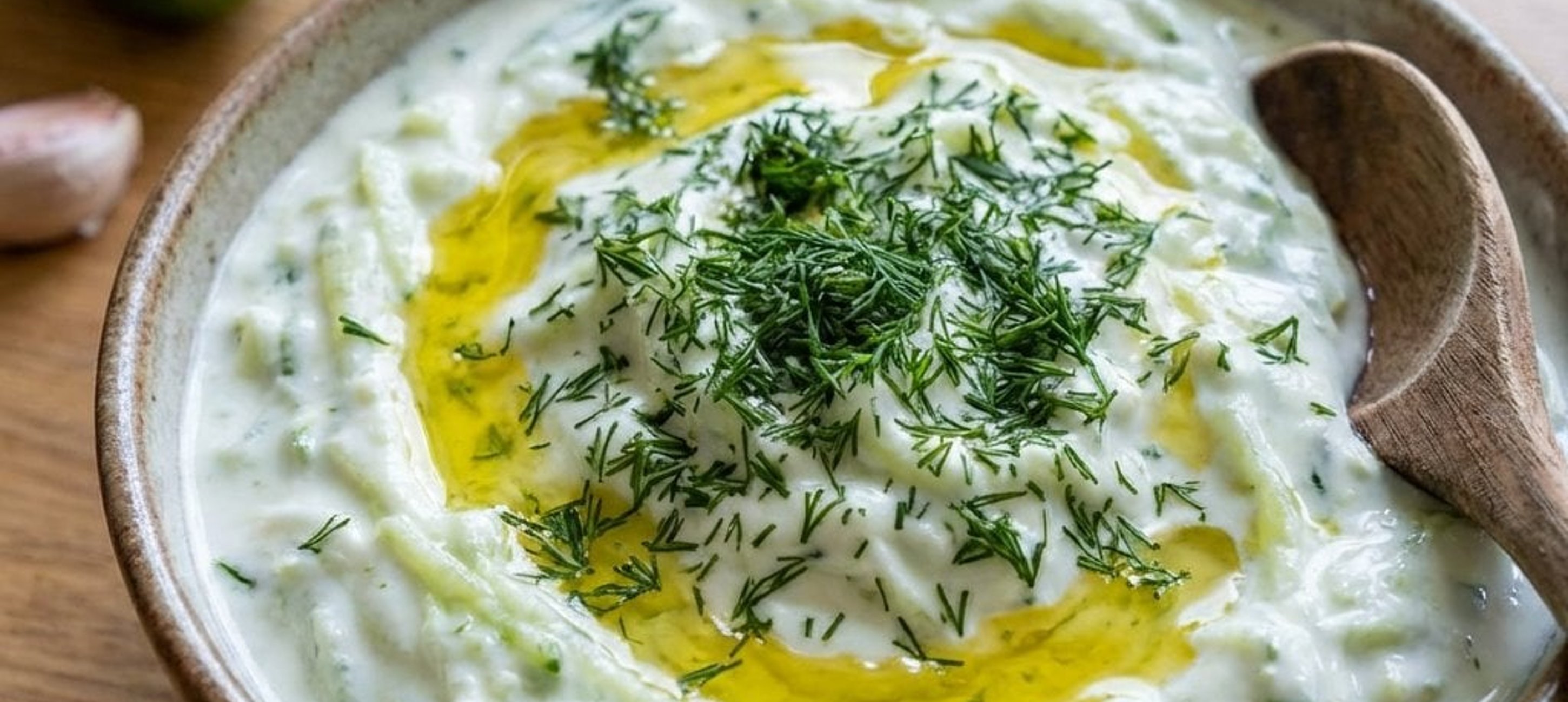 - 3A lecsepegtetett uborkát alaposan kinyomkodjuk, majd egy tálban összekeverjük a görög joghurttal, a fokhagymával, az aprított kaporral, a citromlével és az olívaolajjal. Tálalás előtt legalább 2 órára hűtőbe tesszük, hogy az ízek összeérjenek. Közvetlenül szervírozás előtt még egyszer átkeverjük.