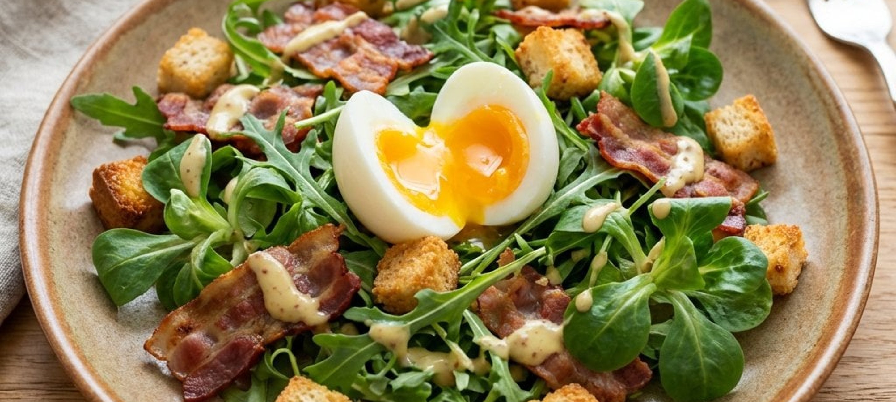 - 2Tányéronként tálaljunk két marék salátakeveréket, szórjuk meg a pirított zsemlével és szalonnával. A közepére helyezzük a fóliából óvatosan kiszabadított, enyhén megsózott tojást. Locsoljuk meg az öntettel, és szórjuk meg a vágott metélőhagymával.
