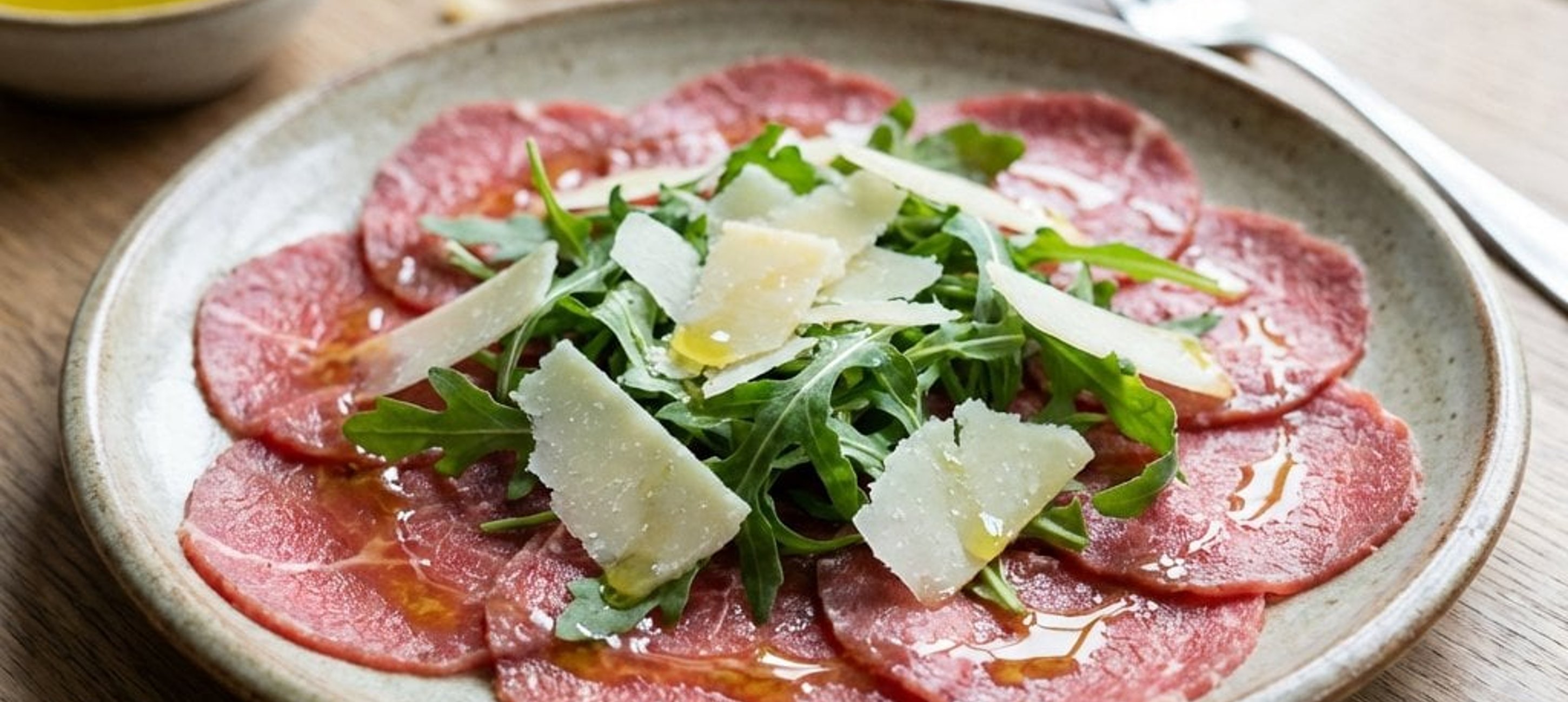 - 4Egy kis tálban forgassa össze a rukkolát egy kevés olívaolajjal és pár csepp citromlével. Enyhén sózza, borsozza, majd halmozza a carpaccio tetejére. Díszítse parmezán forgáccsal és citromszeletekkel.