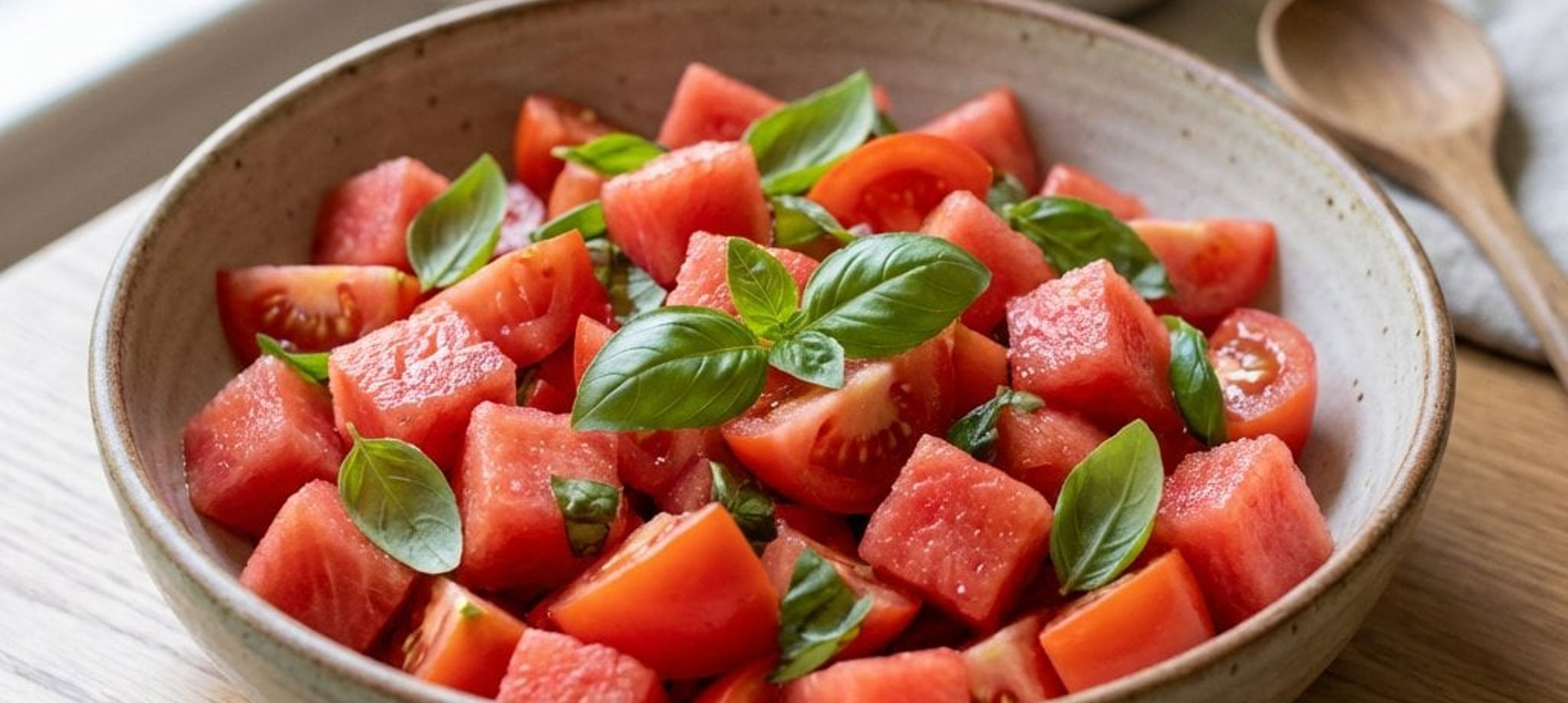 - 2A behűtött görögdinnyét vágjuk a paradicsommal megegyező méretű kockákra. A bazsalikomleveleket vágjuk vékony csíkokra.