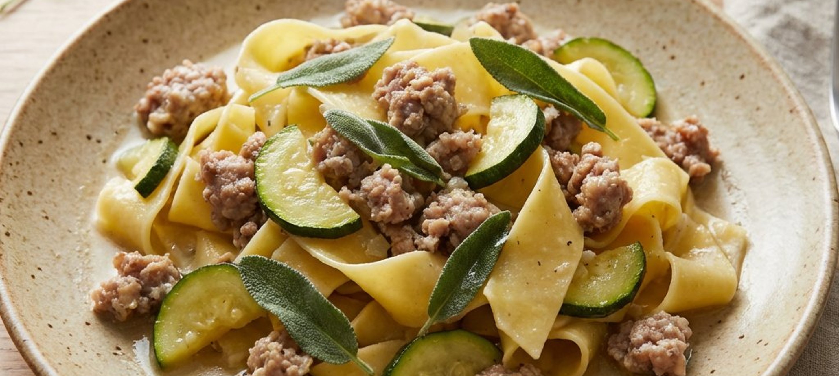 - 5Adjuk hozzá a szétmorzsolt kolbászhúst, sózzuk, borsozzuk és keverjük össze. Adjuk hozzá a cukkinit, és gyakori kevergetés mellett pirítsuk 3 percig. Öntsük hozzá a fehérbort, és hagyjuk elpárologni.