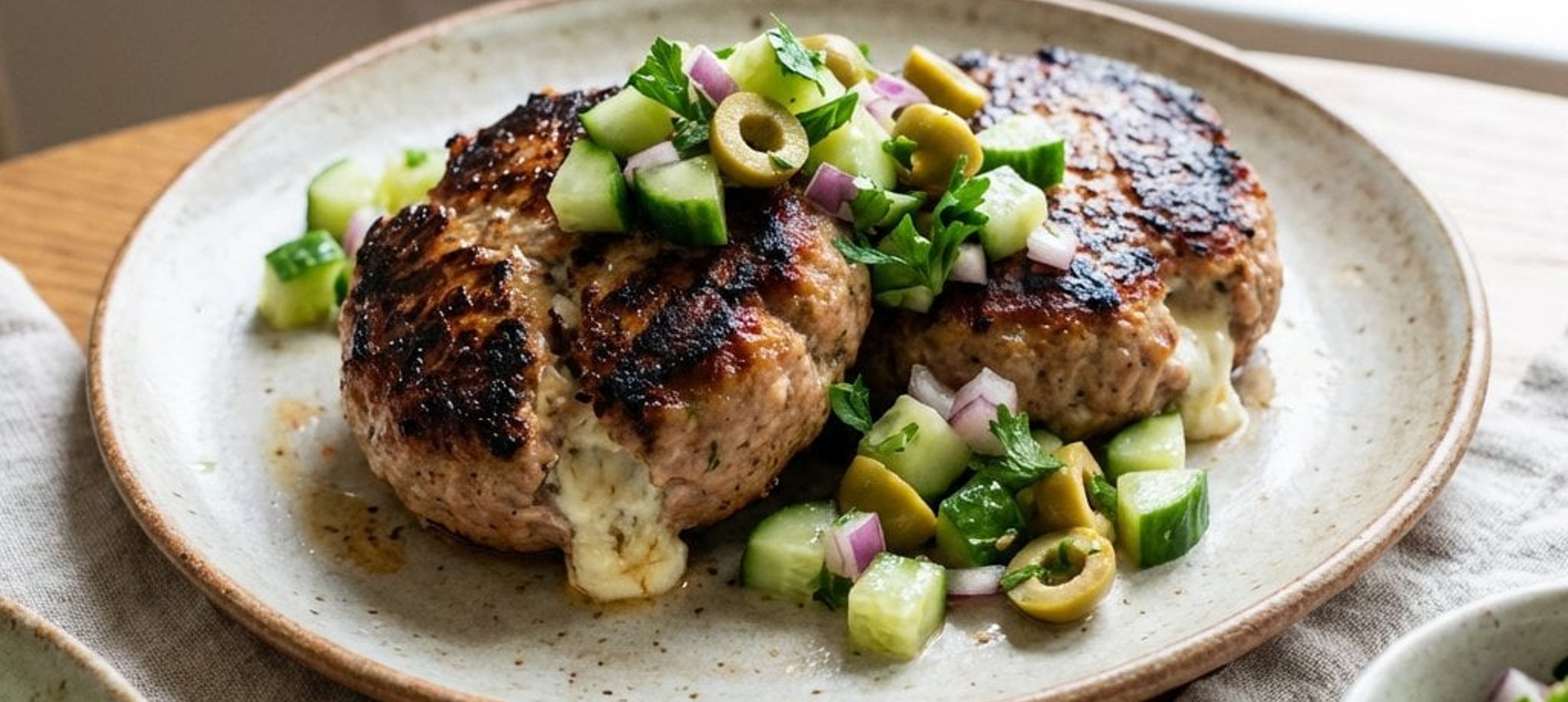 - 3A sajt kivételével keverjük össze a húst, hagymákat, chilit, olívát, zsemlemorzsát, mentát, sót és borsot egy tálban, és tegyük a hűtőbe 20 percre pihenni. Ezután osszuk a fűszerezett húst 8 részre, és mindegyikből formázzunk egy-egy lepényt.