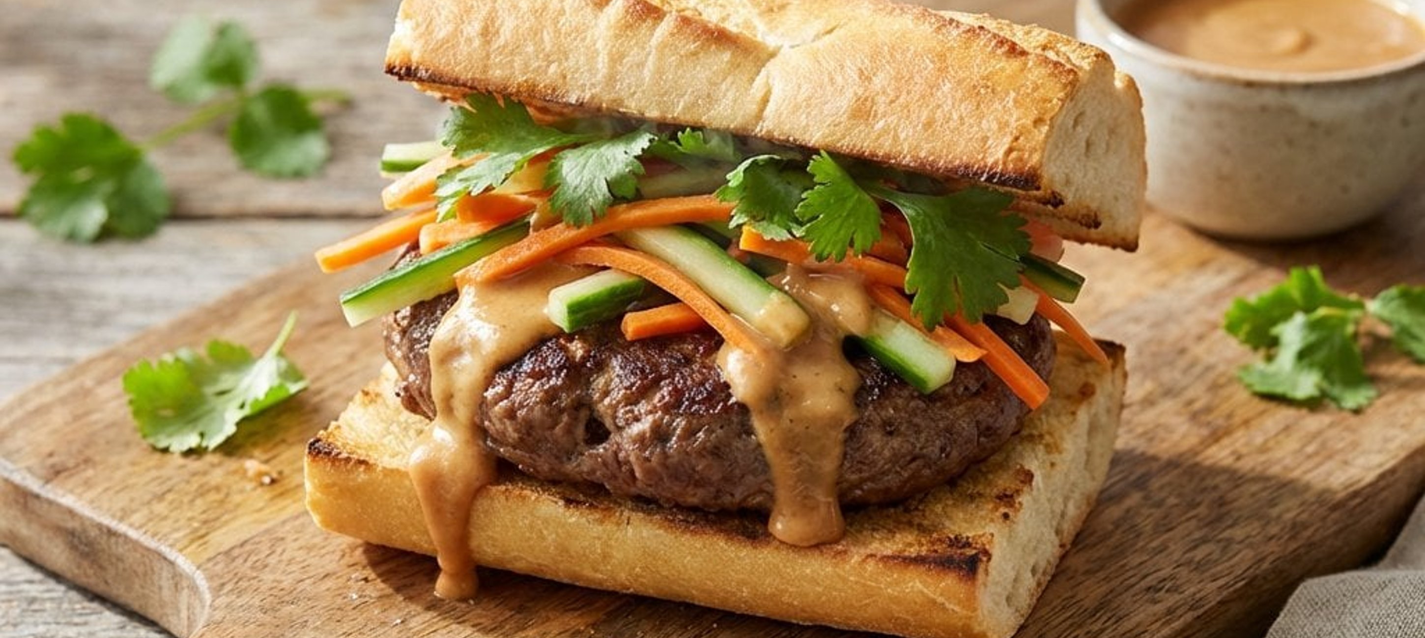 - 2Kend meg a bagettek alját a mogyoróvajas szósszal, helyezd rá a sült húspogácsát, majd halmozd rá a lecsepegtetett savanyított zöldségeket, az újhagymát és a friss koriandert. Zárd le a bagett tetejével és tálald azonnal.