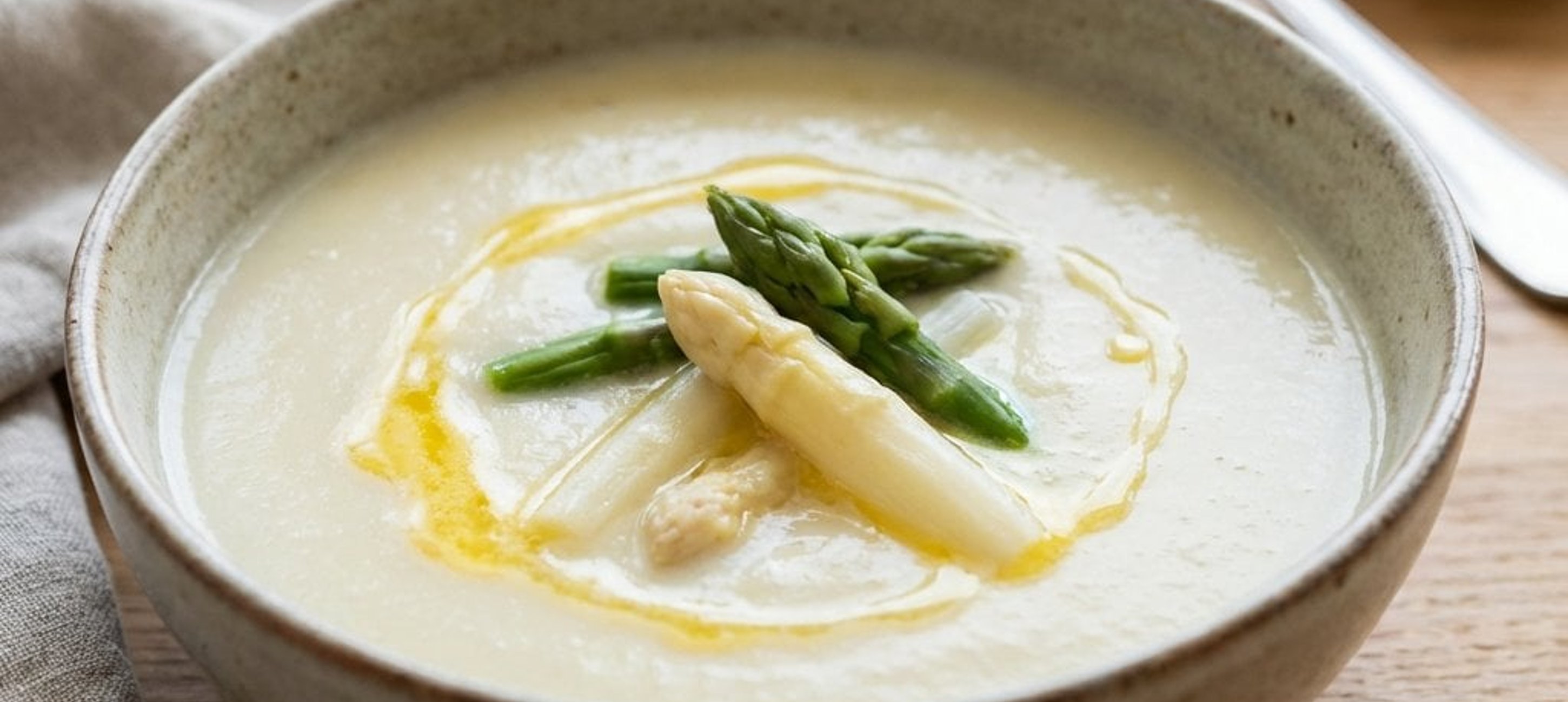 - 4Mérjünk ki 1 litert a spárga főzőlevéből. Adjuk hozzá a fehér spárga szárait, és botmixerrel vagy turmixgépben alaposan pürésítsük. A krémesebb végeredmény érdekében a levest egy finom szűrőn passzírozzuk át egy tiszta lábasba.