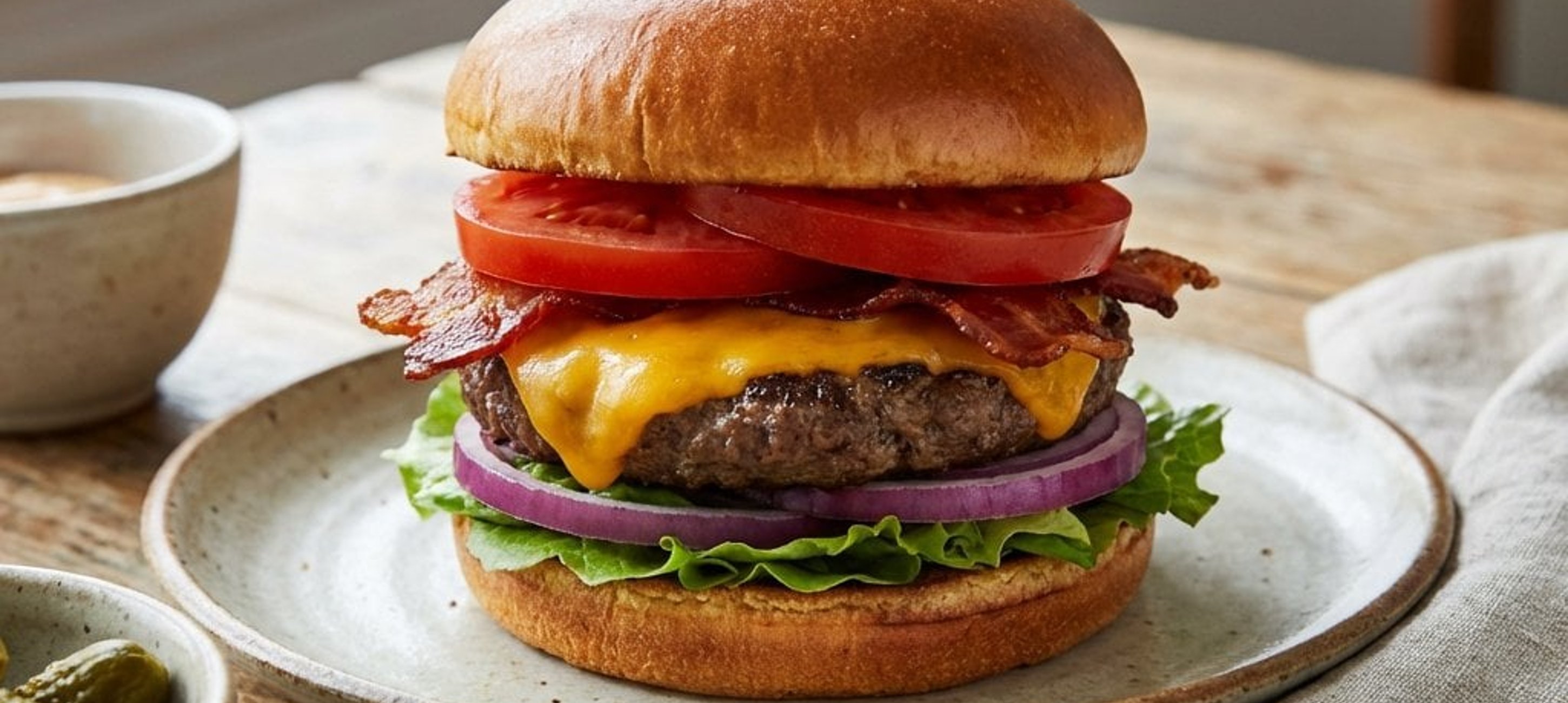 - 4Minden zsemlefélre kenjünk 1 evőkanál fűszeres majonézt. A zsemle alsó részére tegyünk jégsalátát, 2 szelet paradicsomot, majd helyezzük rá a sajtos húspogácsát. Erre tegyünk ismét 2 szelet paradicsomot, a sült bacont és a hagymakarikákat. Végül fedjük le a zsemle felső részével.