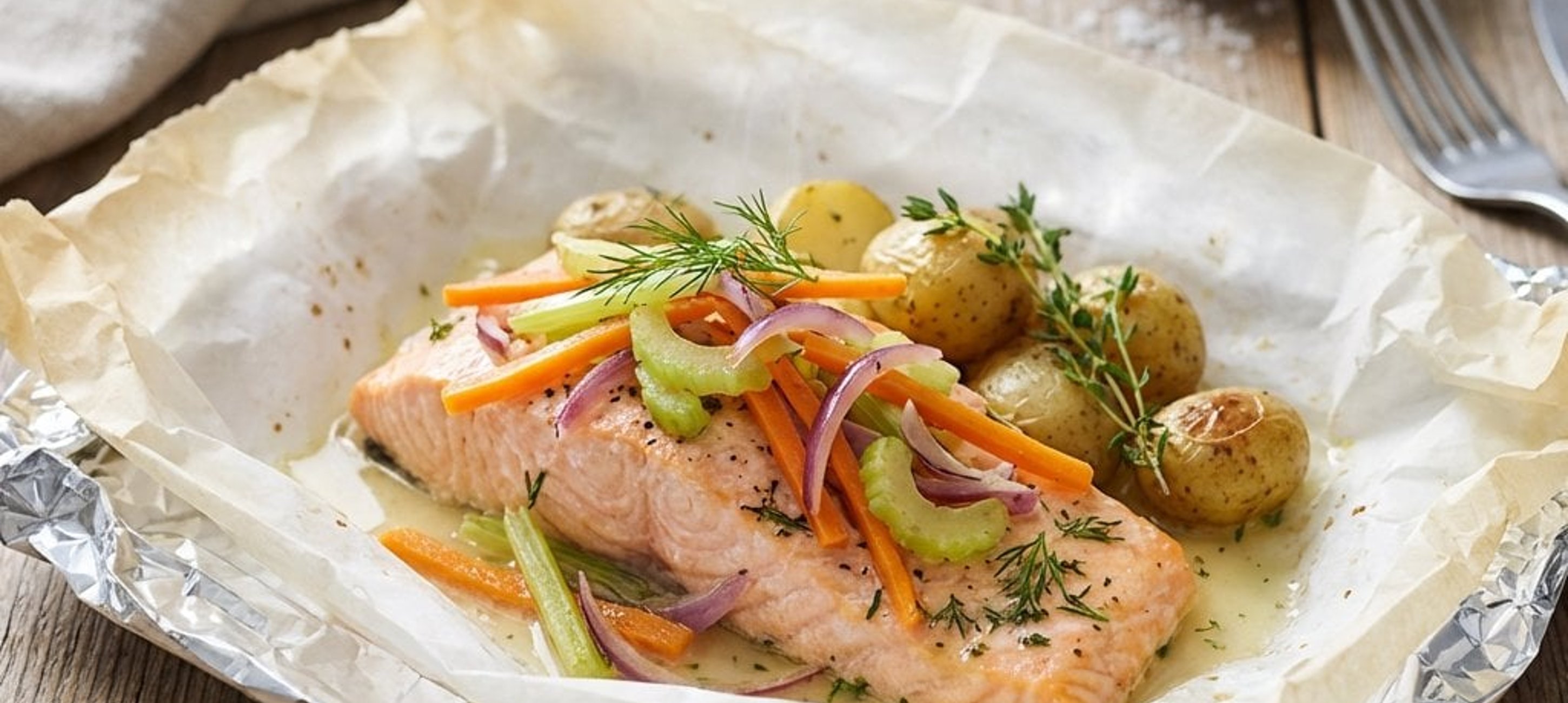 - 1A lazacot vágjuk kb. 4 mm vastag szeletekre, fektessük a zöldségágyra, majd borsozzuk meg. A burgonyákat sózzuk meg, és helyezzük a hal mellé. Locsoljuk meg egy evőkanál olajjal és két evőkanál fehérborral.
