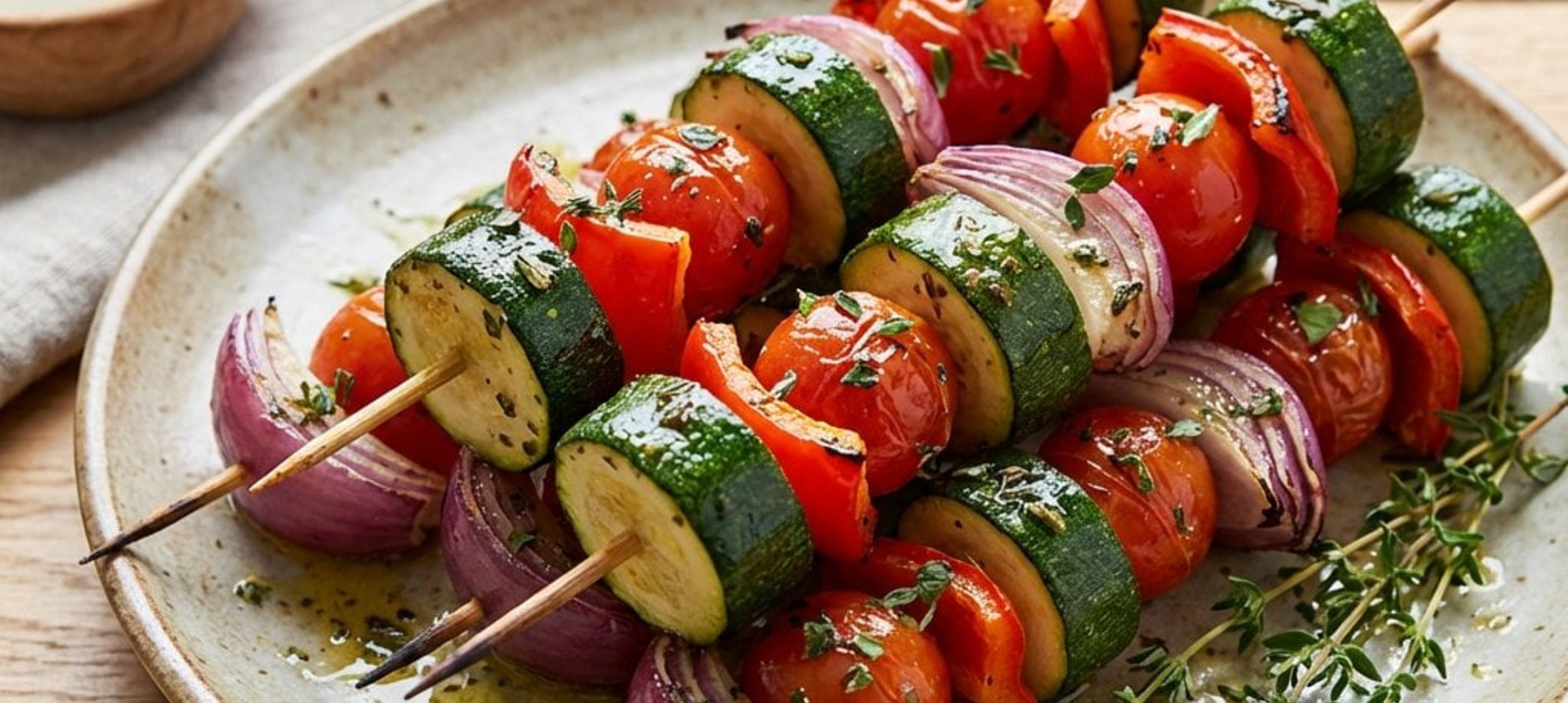 A nyársakra más finomságokat is fűzhet, például kukoricát, spárgát, gombát, kelbimbót, vagy akár tofu-, tempeh- vagy halloumi sajt darabokat is.