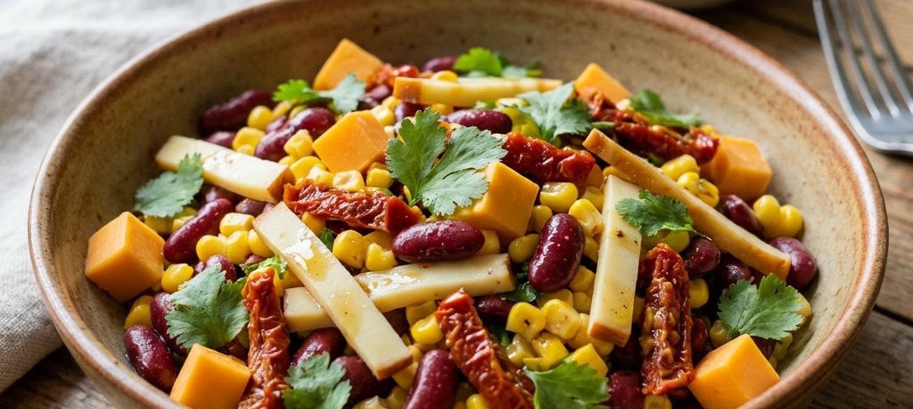 - 3Egy másik tálban keverjük össze a felkockázott cheddart, az aszalt paradicsomot, a leöblített vörösbabot, a kukoricát, a reszelt gyömbért and az aprított koriandert.