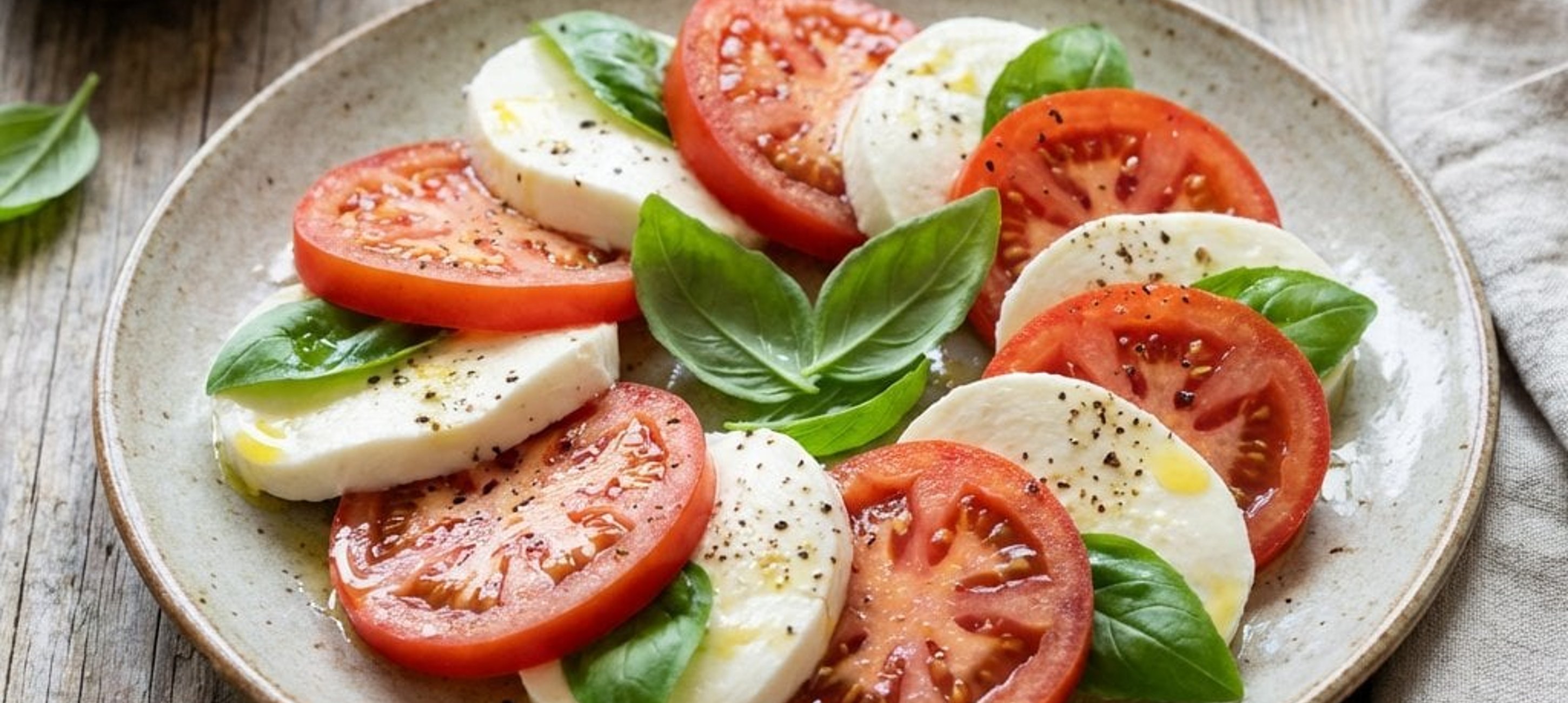 - 3Egy tálon felváltva rendezzük el a paradicsom- és mozzarellaszeleteket. Szórjuk rá a friss bazsalikomleveleket (a nagyobbakat kézzel tépkedjük meg).