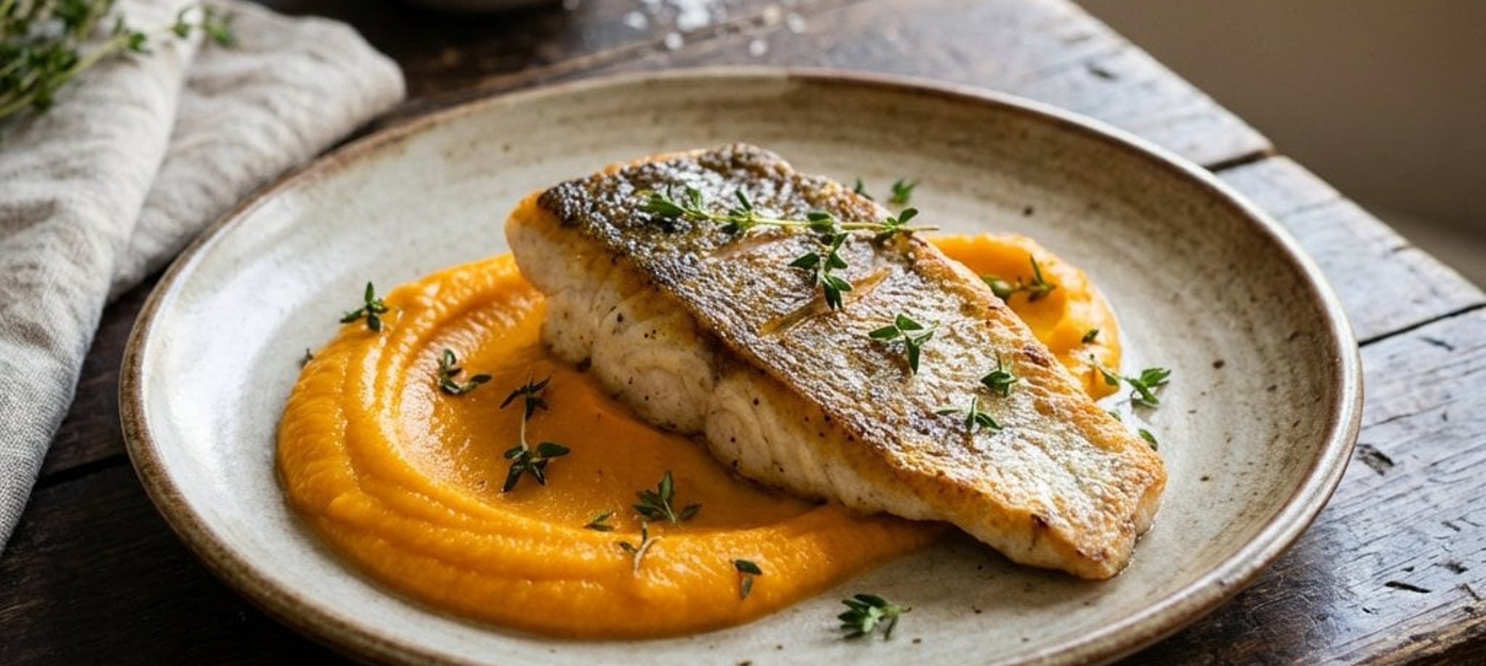 A tökéletesen ropogós bőrhöz fontos, hogy a halat sütés előtt papírtörlővel teljesen szárazra töröljük. A püré selymességét a szitán való átpasszírozás adja meg igazán.