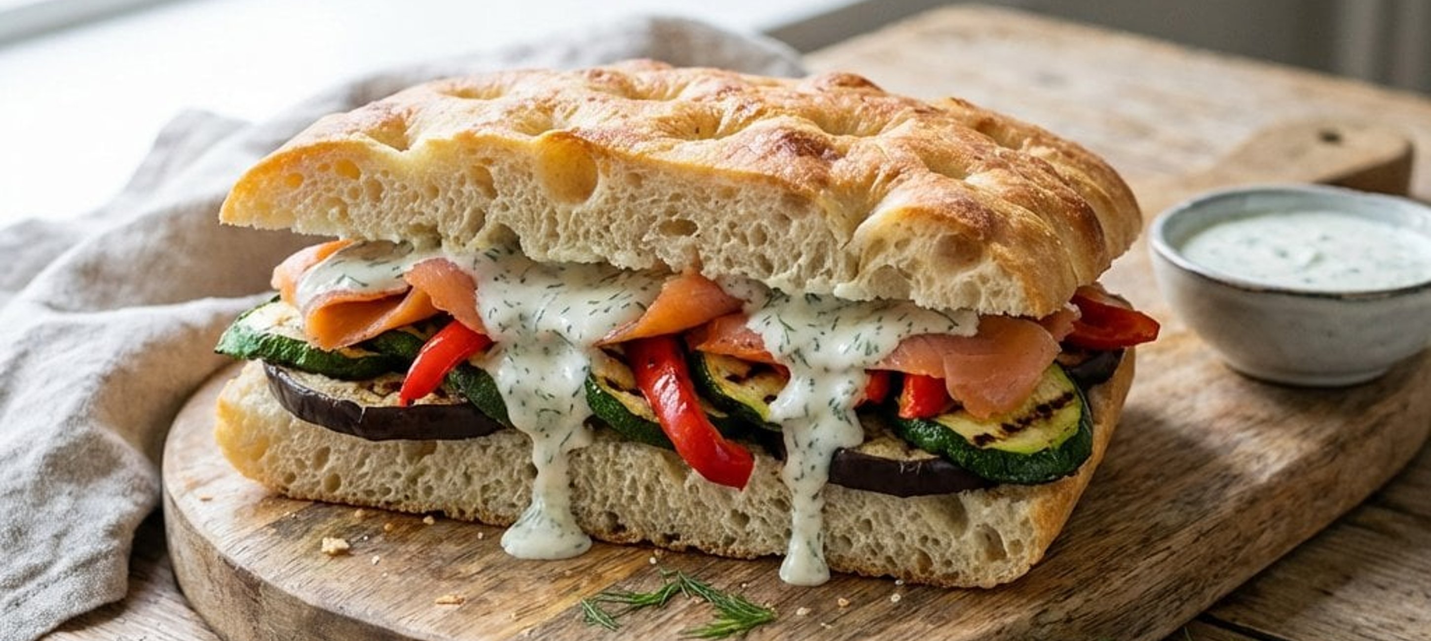 - 4A crème fraîche-t keverjük össze a finomra vágott kaporral és a füstölt paprikával. Ízlés szerint sózzuk, borsozzuk. Ezzel a remulád mártással kenjük meg a megpirított focaccia belsejét.