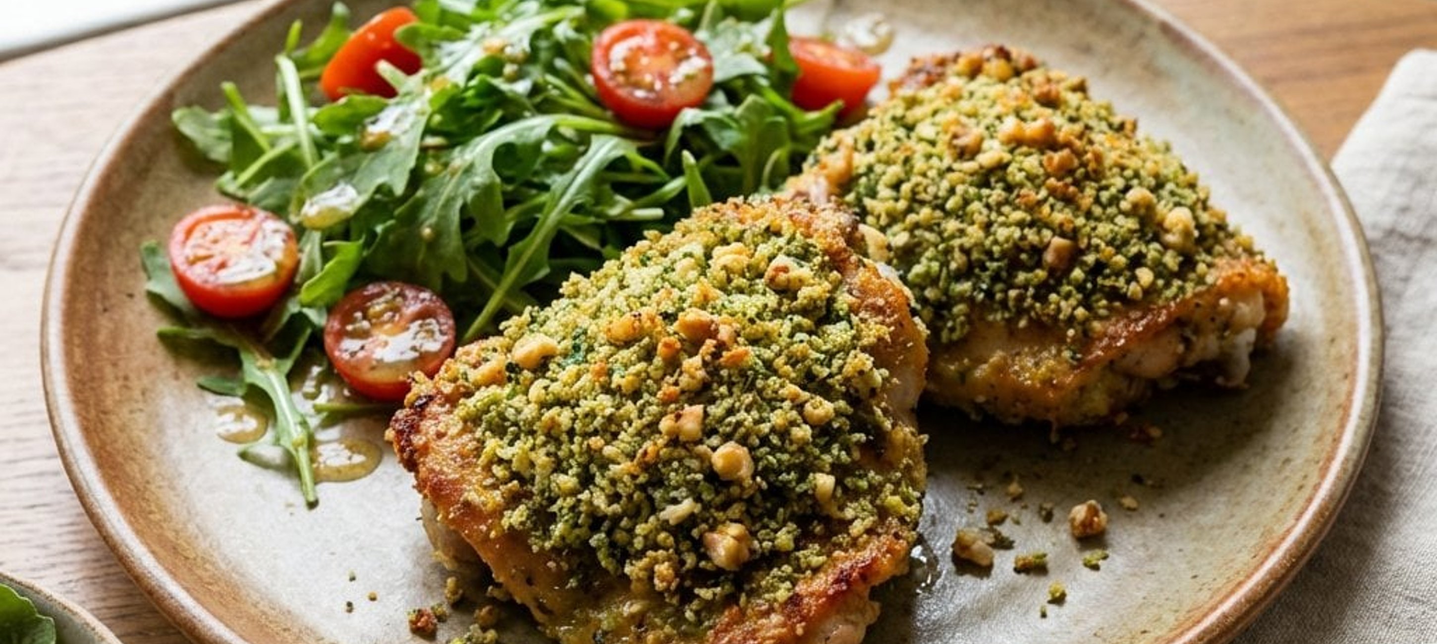 - 1A petrezselymet, egy teáskanálnyi aprított rozmaringot, 40 g vajat, a diót, 30 ml olívaolajat, egy csipet sót és a citromhéjat tegyük egy aprítóba, és dolgozzuk össze.