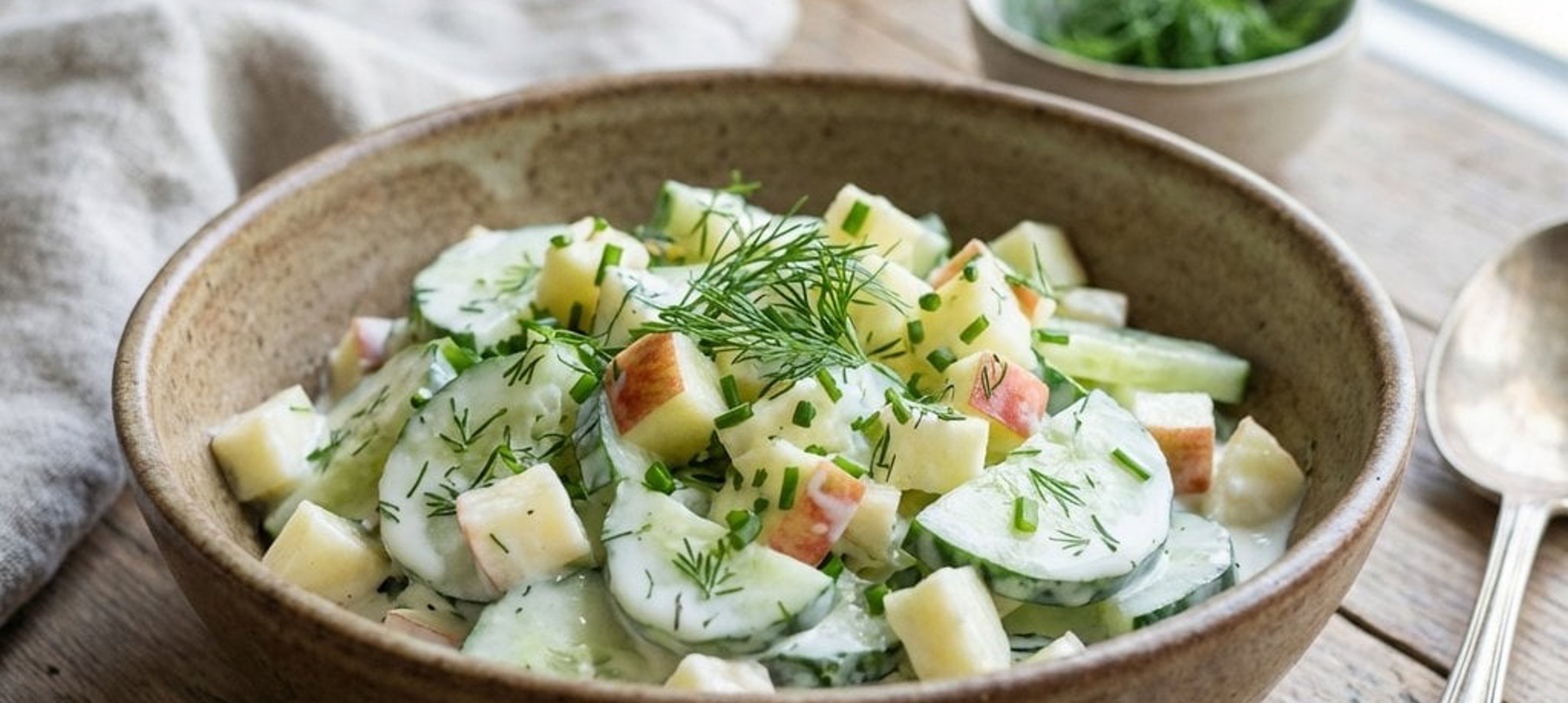 - 3Egy tálban keverjük össze az összes előkészített alapanyagot (uborka, alma, zeller, aprított kapor és metélőhagyma, citromlé, joghurt és fűszerek). Ízlés szerint sózzuk, borsozzuk, majd tegyük a hűtőbe lehűlni. Tálalás előtt még egyszer keverjük át.
