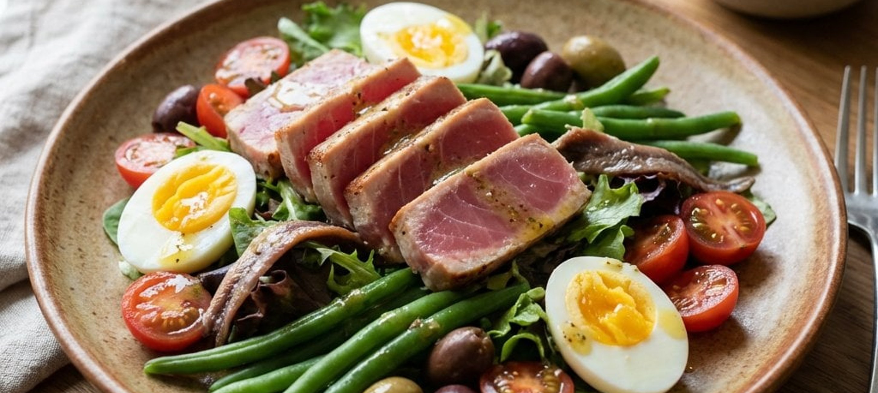 - 3Egy nagy tálba tesszük az előkészített zöldségeket (burgonya, zöldbab, paradicsom, paprika, uborka, hagyma, olívabogyó, kapribogyó), meglocsoljuk az öntettel, és óvatosan összeforgatjuk. A tetejére helyezzük a tonhal szeleteket, a tojásgerezdeket és a szardella filéket. Frissen tálaljuk.
