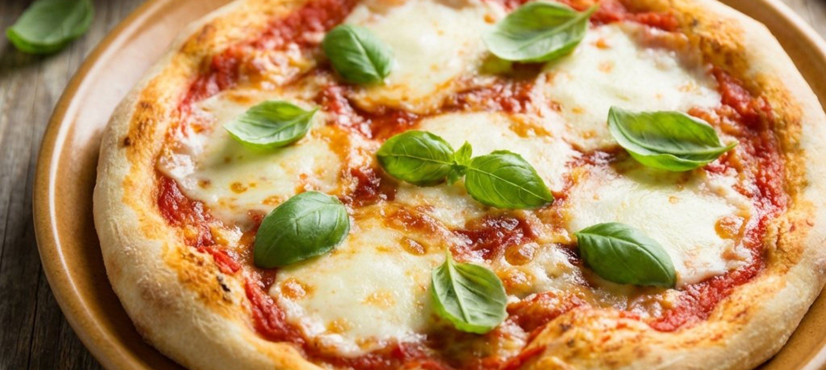 - 5A kész pizzát kivesszük a sütőből, és elosztjuk rajta a friss bazsalikomleveleket.