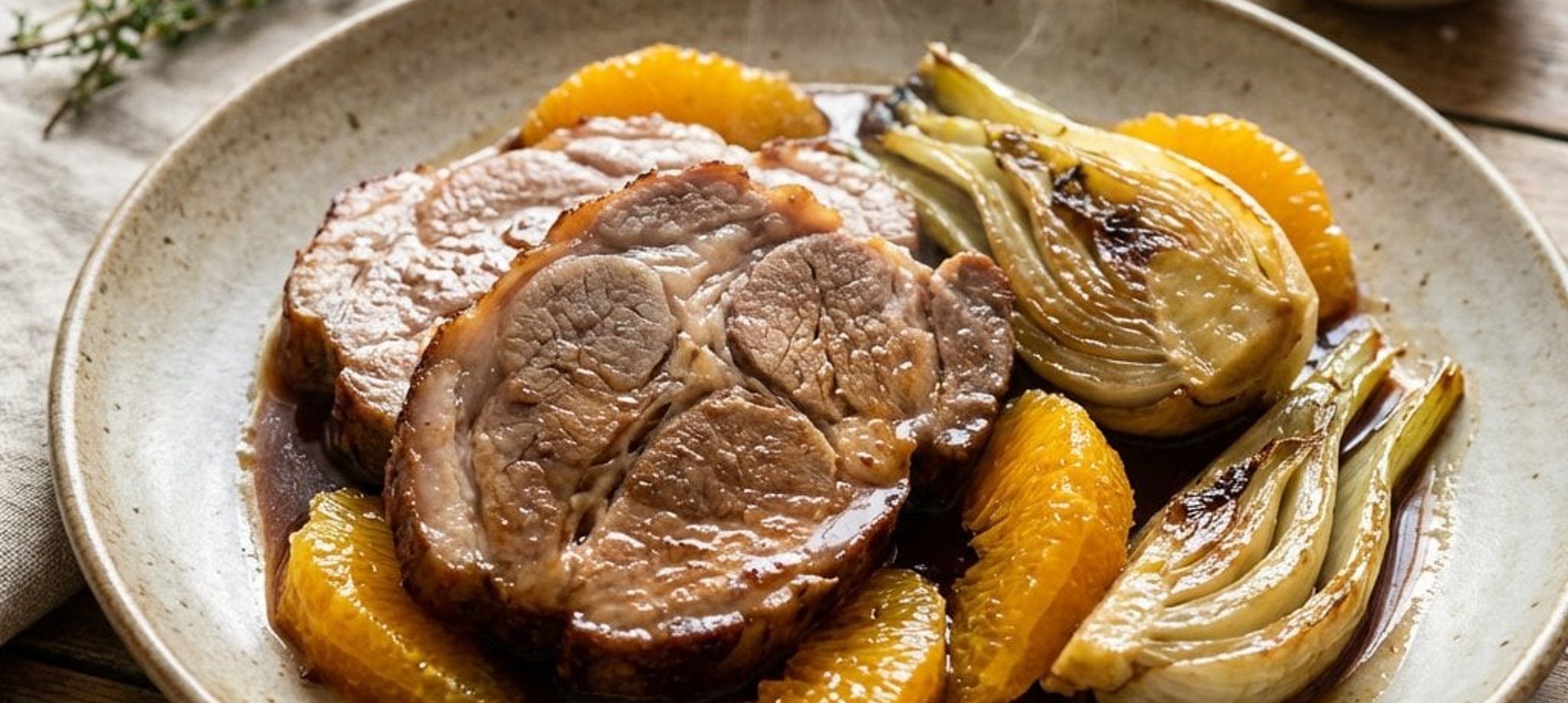 - 6A sütési idő után emeljük a hőmérsékletet 190 °C-ra, vegyük le a fedőt, fordítsuk meg a húst, szórjuk rá a reszelt narancshéjat, és süssük további 20 percig, amíg szép piros lesz. Szeletelés előtt hagyjuk a húst 10 percig pihenni.