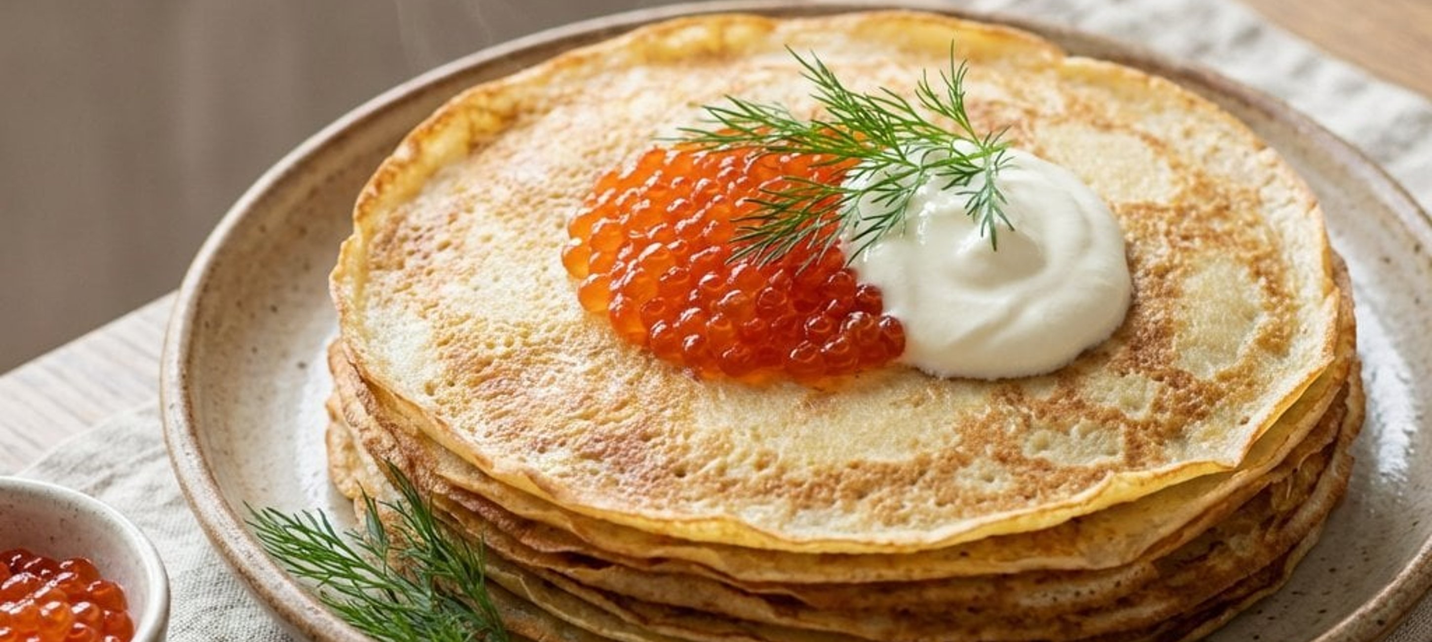 - 2A meleg bliniket tálalja egy-egy kanál tejföllel, kaviárral, egy szelet citrommal és friss kaporral. Szórja meg reszelt citromhéjjal és a maradék frissen őrölt borssal.