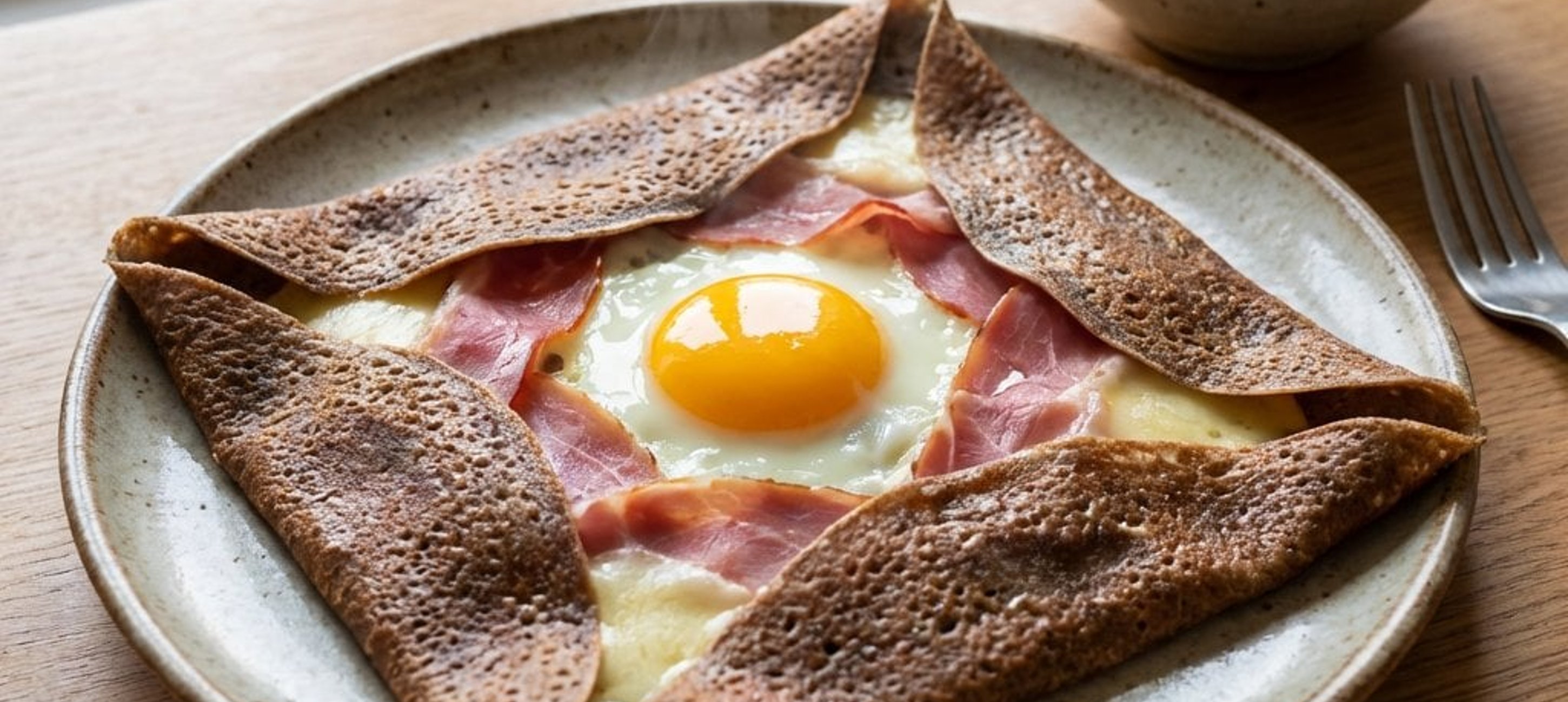 - 4Süssük a galette-et az egyik oldalán aranybarnára, majd fordítsuk meg. A közepére üssünk egy friss tojást, sózzuk, borsozzuk, majd rakjuk körbe a sonkacsíkokkal és szórjuk meg a reszelt sajttal.