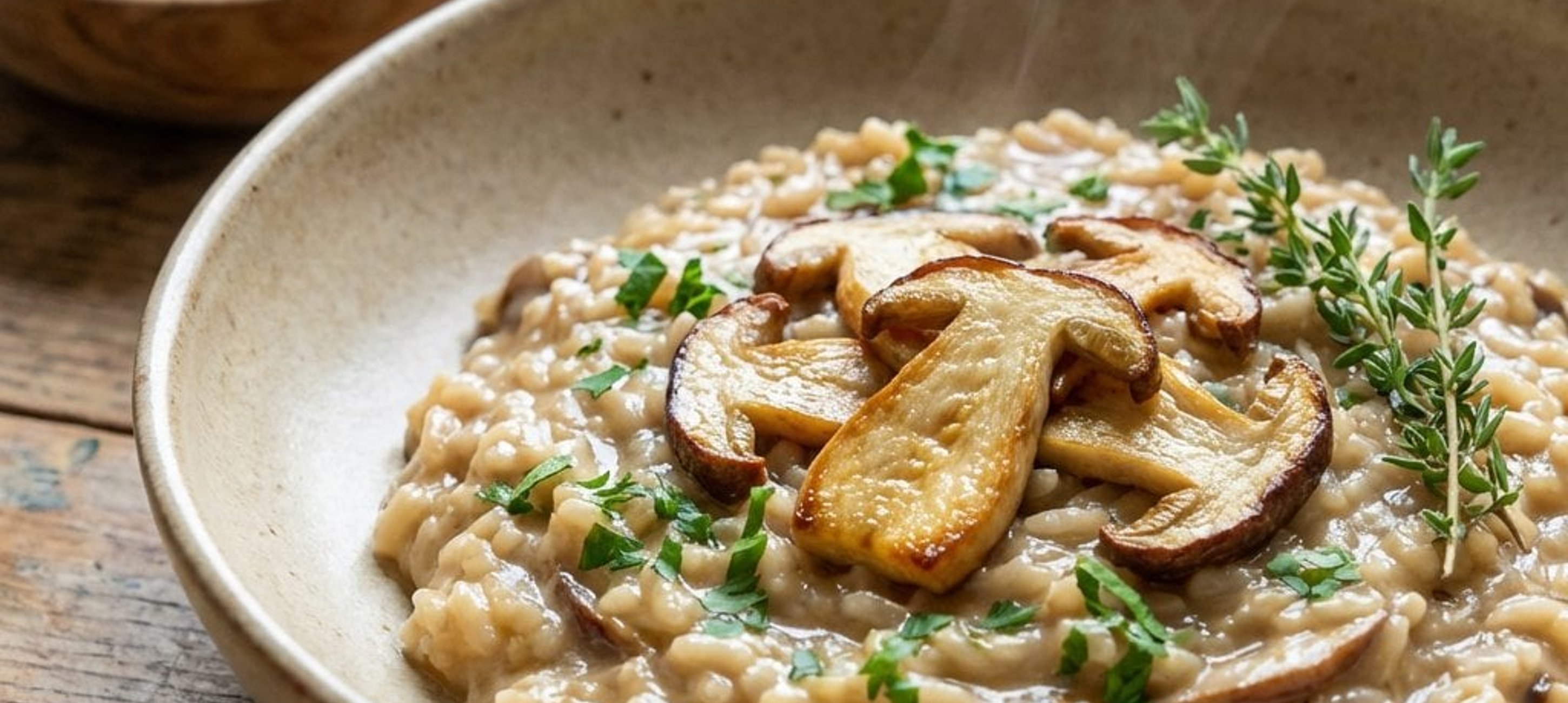 - 2A krémes rizottót tálaljuk mélytányérban, a tetejére halmozzuk a pirított gombaszeleteket. Friss fűszernövényekkel díszíthetjük.