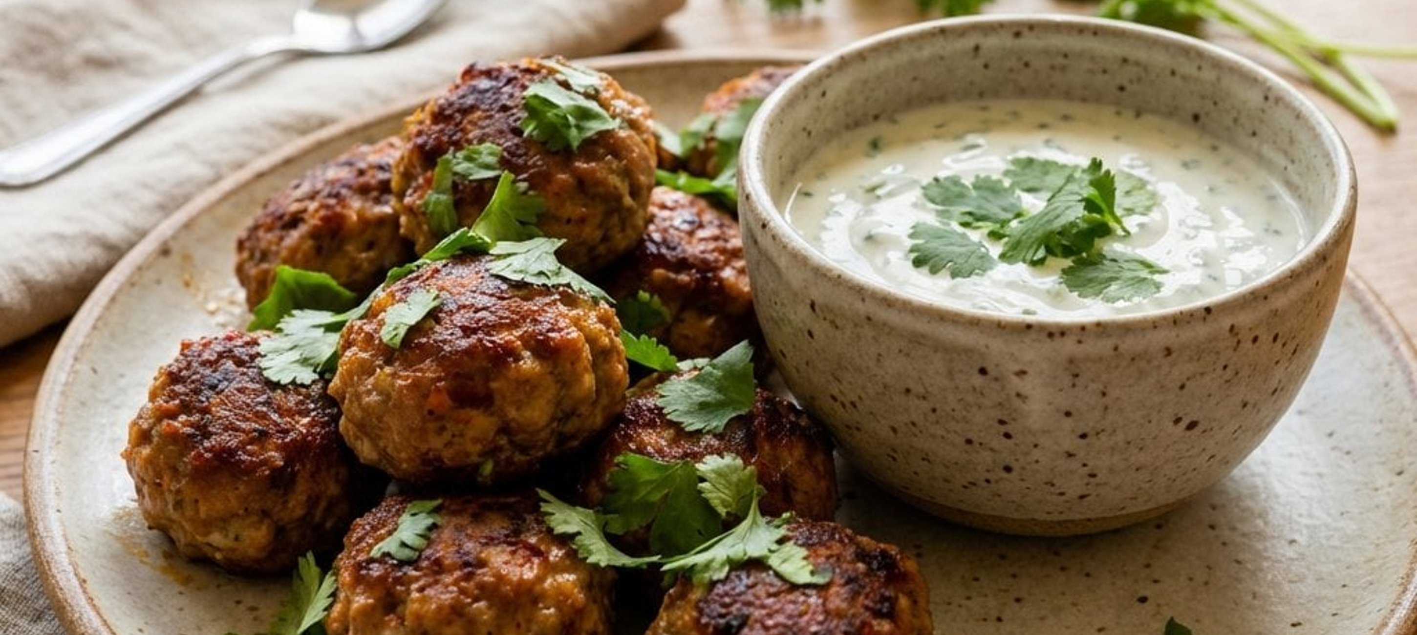 - 5A mártogatóshoz keverjük össze a natúr joghurtot az aprított friss korianderrel, majd ízlés szerint sózzuk és borsozzuk. Tálaljuk a golyókat a dippel.