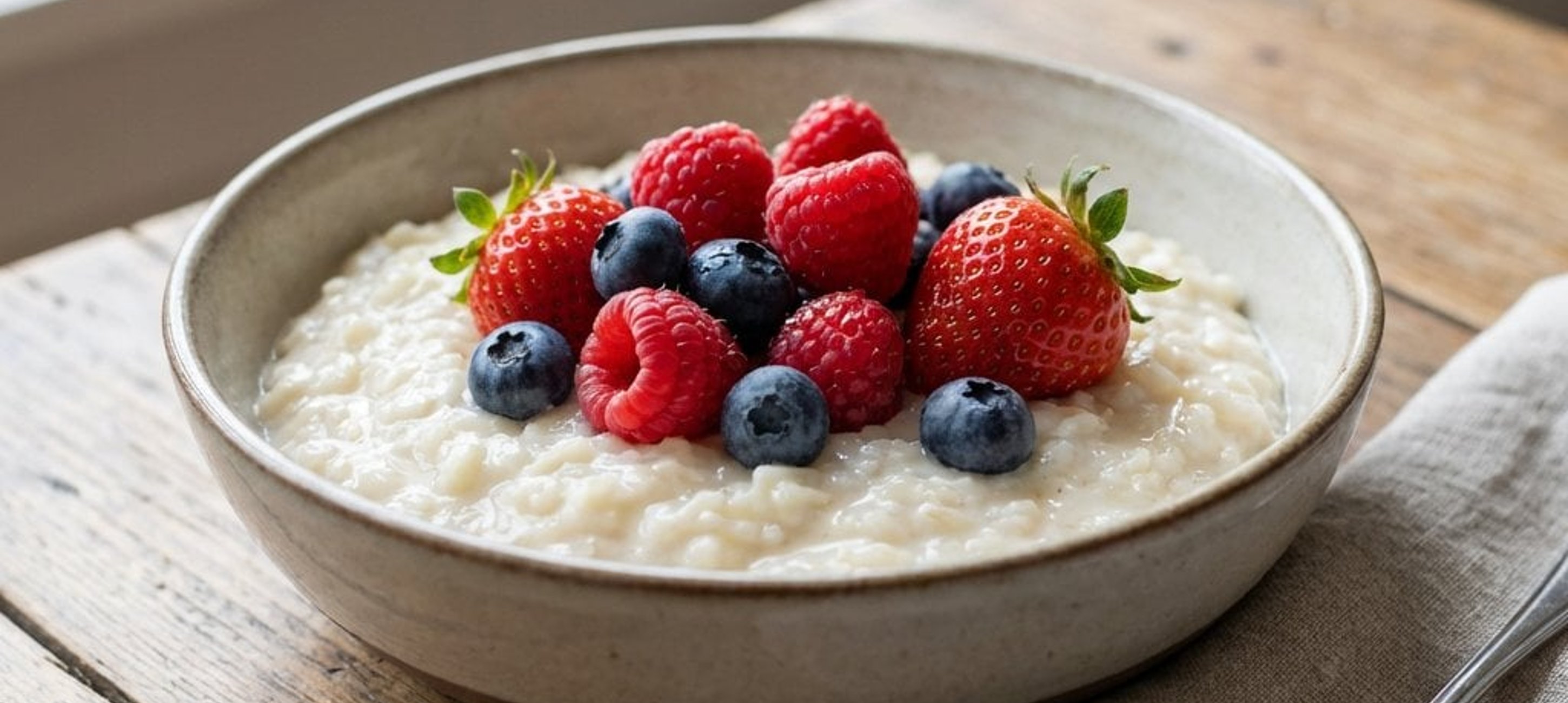 - 4A kész, krémes rizst osszuk el tányérokba vagy tálkákba, and díszítsük bőségesen friss gyümölcsökkel.