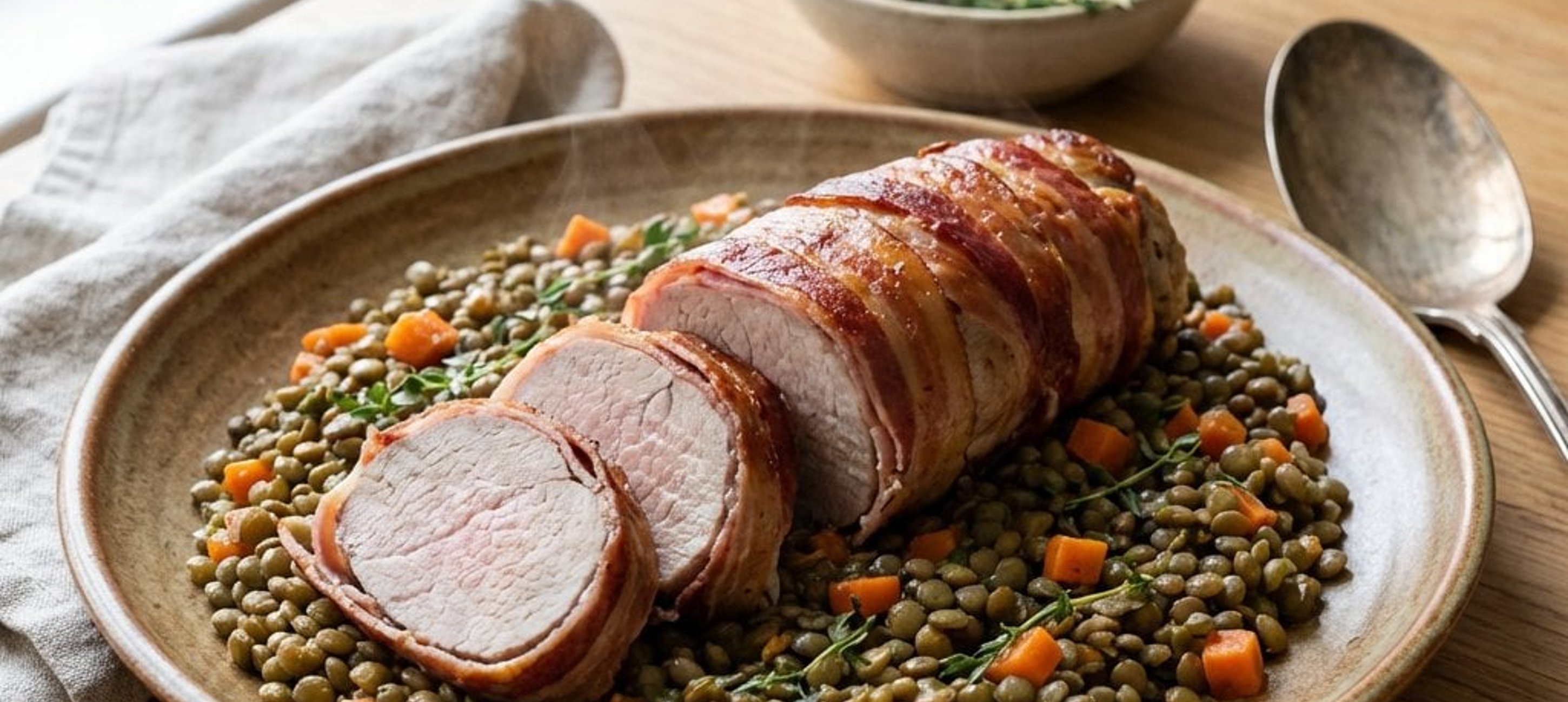 - 3A hústekercseket száraz, forró serpenyőben minden oldalukon süssük aranybarnára, kezdve ott, ahol a szalonna szélei találkoznak. Ezután tegyük őket egy tepsire, és süssük az előmelegített sütőben pontosan 8 percig.