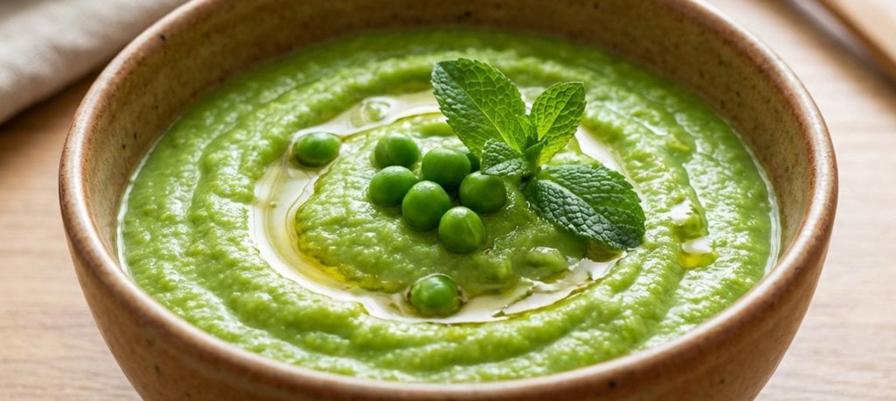 - 4A még finomabb eredmény érdekében a pürét egy finom szitán is átpasszírozhatjuk. Tálaláskor díszíthetjük pár szem egész borsóval és néhány csepp olívaolajjal.