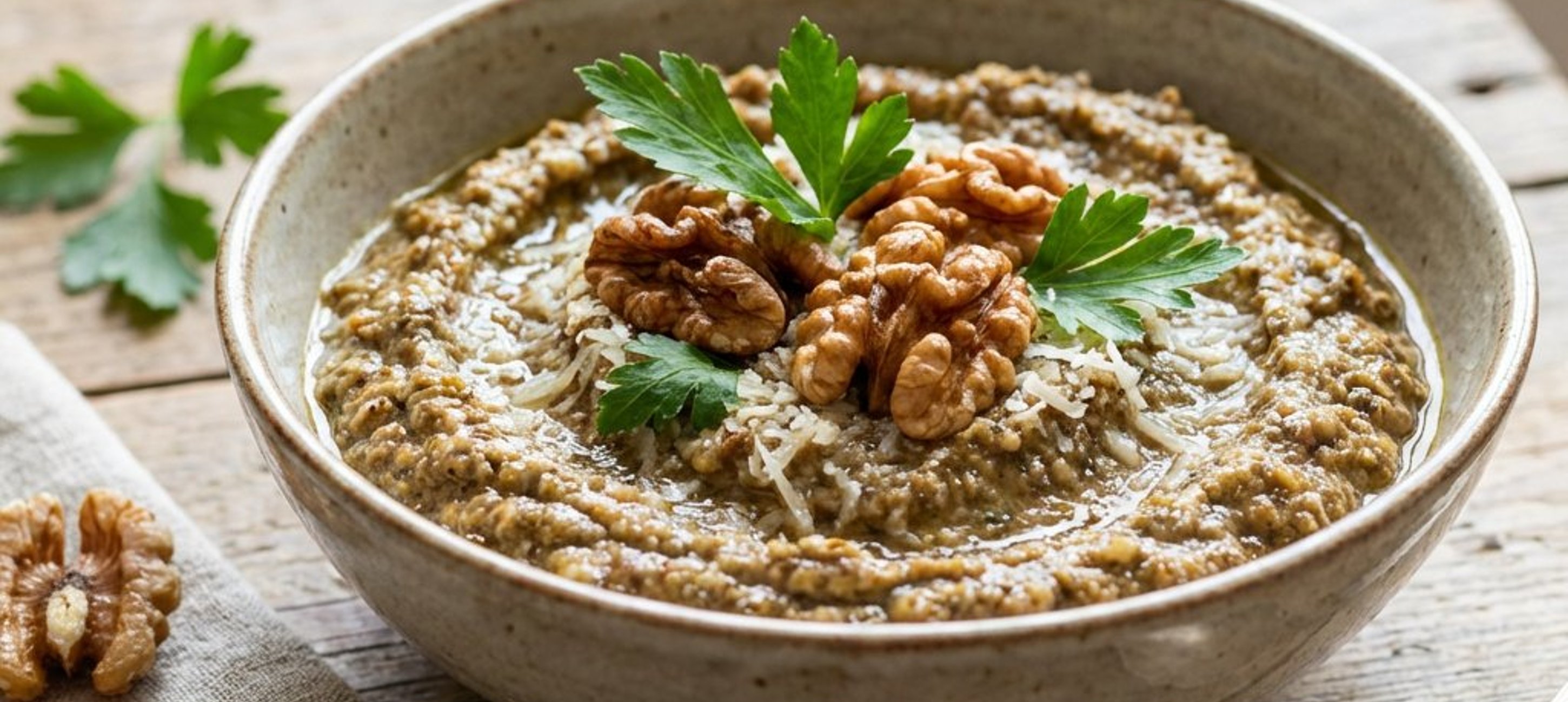 - 3Tegyük az összes hozzávalót (sült dió, fokhagymás vaj, reszelt Grana Padano, olívaolaj, fehérborecet, aprított petrezselyem, bors és só) egy turmixgépbe. Adjunk hozzá 4 evőkanál vizet, és turmixoljuk össze a kívánt állagúra. Kóstoljuk meg, és ha szükséges, adjunk hozzá még egy kevés sót.