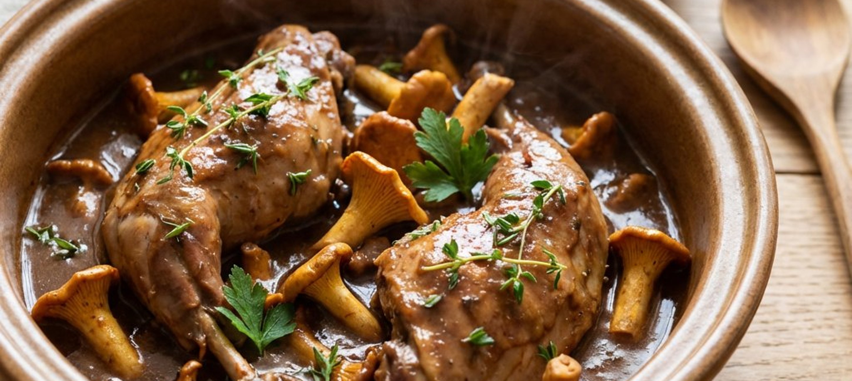 - 3A nyúl párolólevét szűrjük át egy finom szitán a gombára. Forraljuk fel, majd alacsony lángon főzzük 2 percig. Vegyük le a tűzről, és keverjük bele a maradék hideg vajat, hogy a mártás selymes legyen. Szükség szerint sózzuk, majd tegyük vissza a nyúlcombokat a kész mártásba, hogy átmelegedjenek.