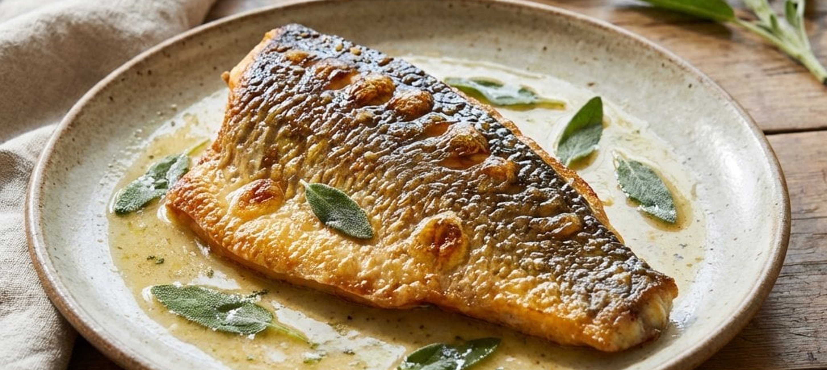 - 4A serpenyőt, amelyben a halat sütöttük, melegítsük fel újra magasabb lángon a visszamaradt zsiradékkal együtt. Adjuk hozzá a zsályaleveleket, és öntsük fel a fehérborral. Forraljuk addig, amíg a bor elpárolog, és csak a zsiradék marad a serpenyőben. Ezután öntsünk hozzá 150 ml vizet, és forraljuk 1 percig, majd vegyük le a tűzről.