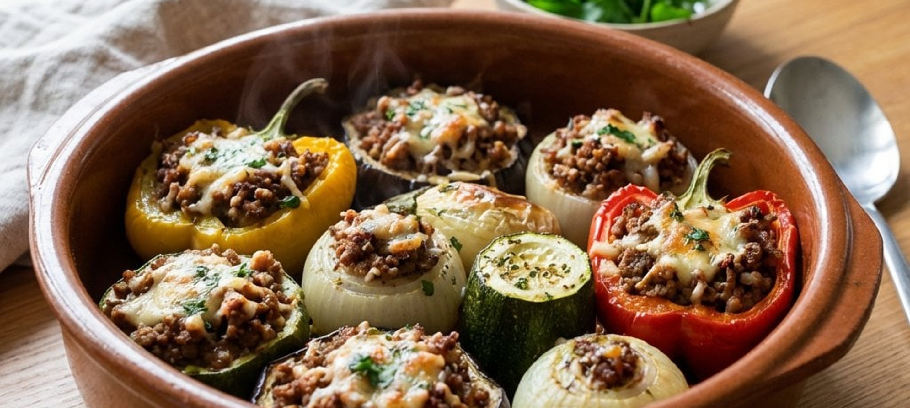 Tálaláskor kínálhatunk mellé friss bagettet vagy egy könnyű zöldsalátát. A töltött zöldségek tetejére szórhatunk egy kevés reszelt sajtot is az utolsó 10 percben a még gazdagabb ízvilágért.