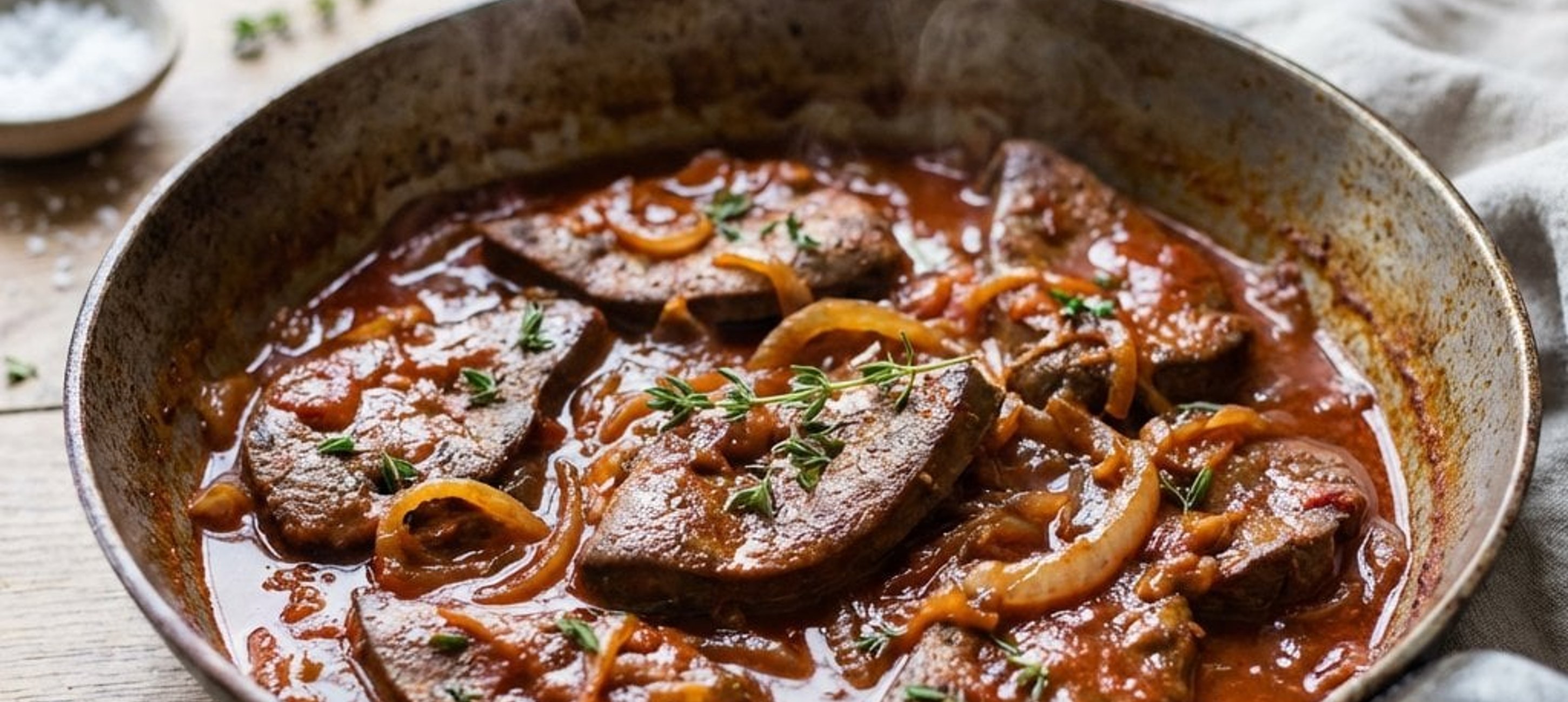 - 2A májat vágjuk 8 szeletre, és mindkét oldalát borsozzuk meg. Egy nagy, mély serpenyőben hevítsük fel az olajat magas hőfokon, majd a májszeleteket oldalanként 1-1 perc alatt hirtelen süssük elő. Szedjük ki őket egy tányérra.
