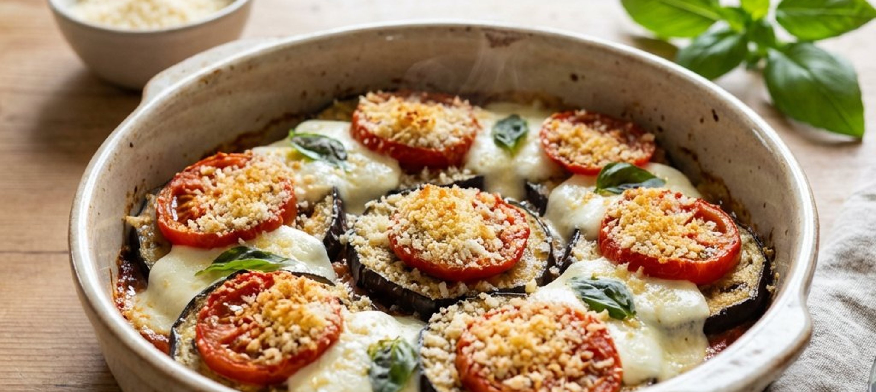- 8Egy tálban keverjük össze a pirított zsemlemorzsát a reszelt parmezánnal, egy csipet sóval és borssal. Ezzel a keverékkel szórjuk meg az étel tetejét, locsoljuk meg az olívaolajjal, majd tegyük a 200 °C-os sütőbe 30 percre.
