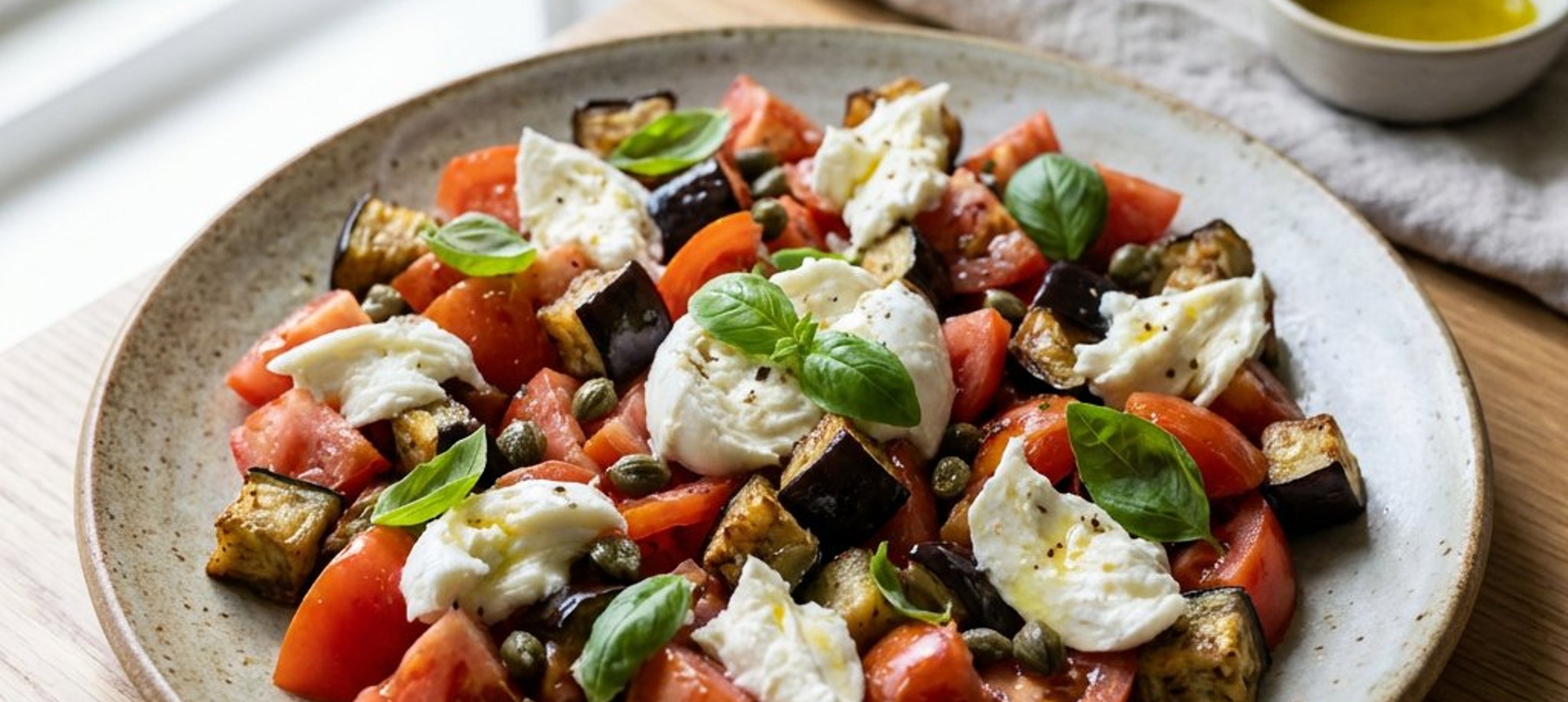 - 4A kihűlt padlizsánt osszuk el a tányérokon. Halmozzuk rá az összekevert zöldségeket és a tépkedett mozzarellát.